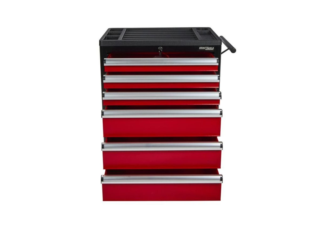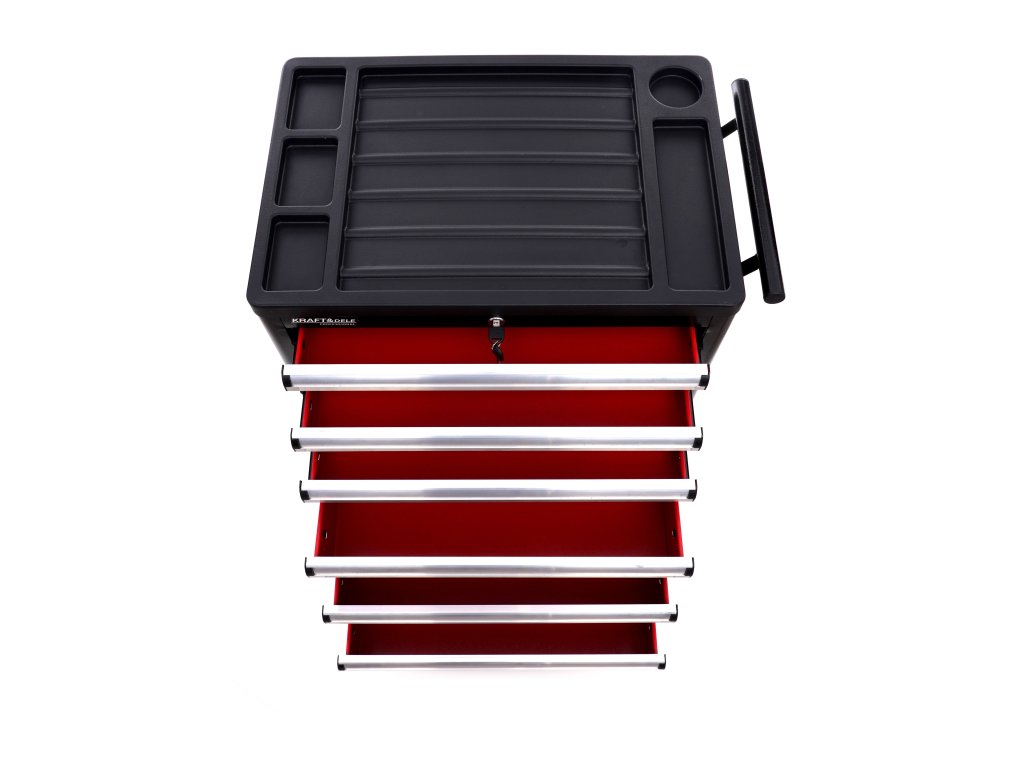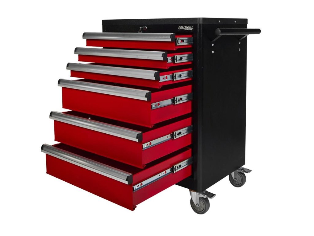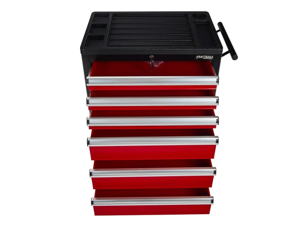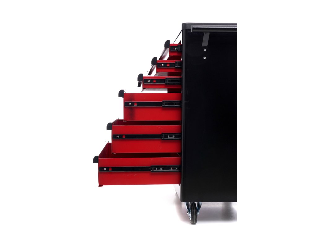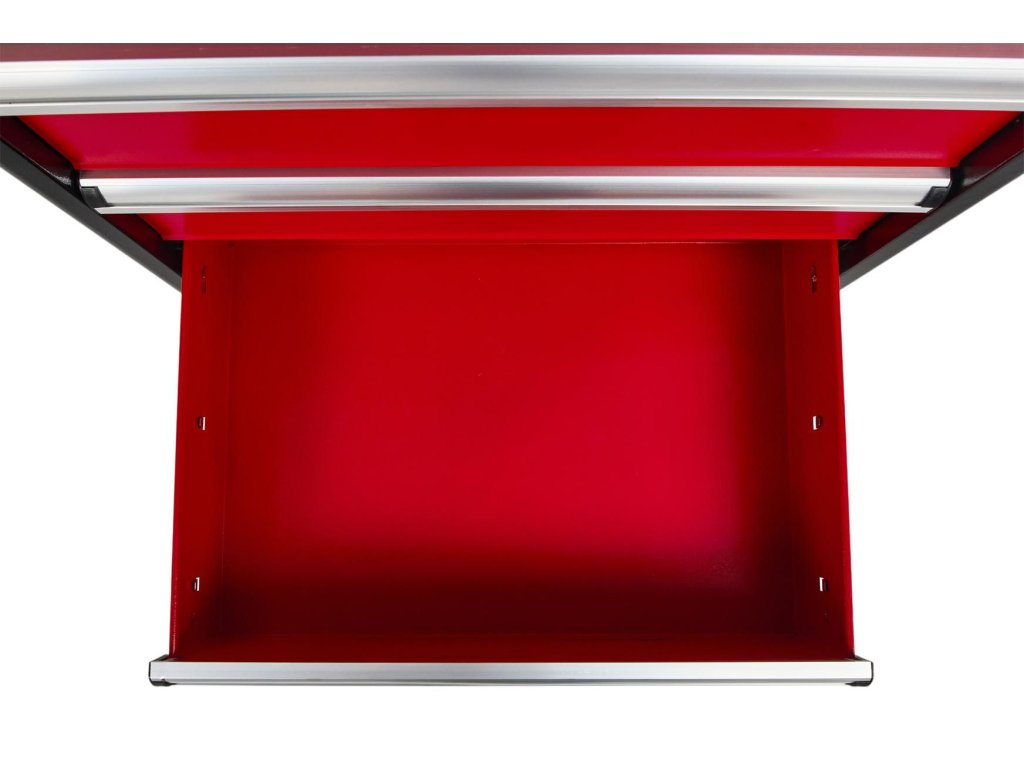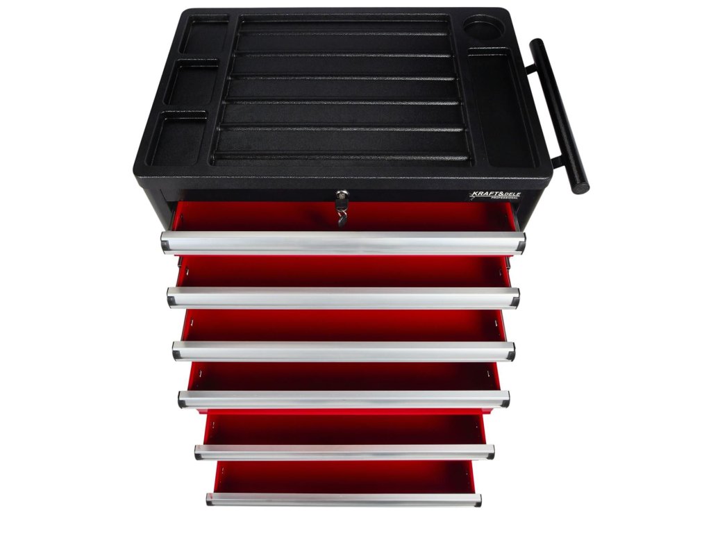 Vozík KD370 je vybaven šesti prostornými zásuvkami pro efektivní uspořádání nářadí. Tři menší zásuvky jsou ideální pro drobnější nástroje, zatímco tři hluboké spodní zásuvky pojmou větší dílenské vybavení. Každá zásuvka je osazena na ložiskových pojezdech, což zajišťuje jejich plynulé, tiché a bezproblémové otevírání a zavírání po dlouhou dobu.