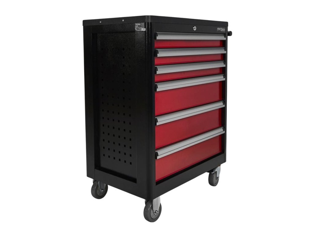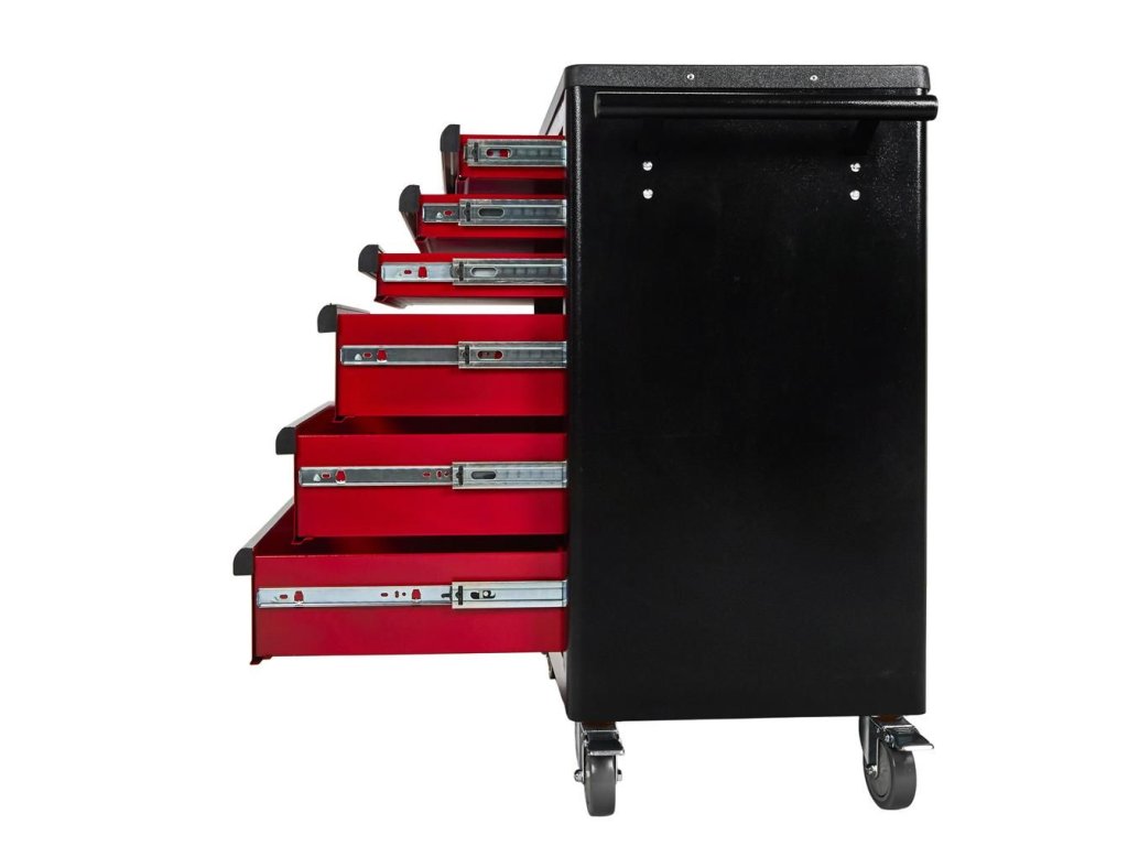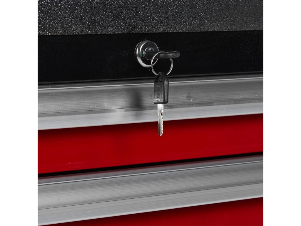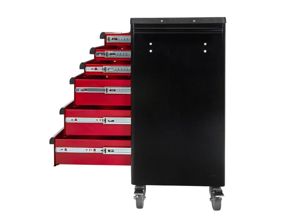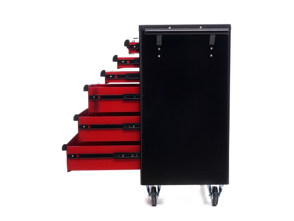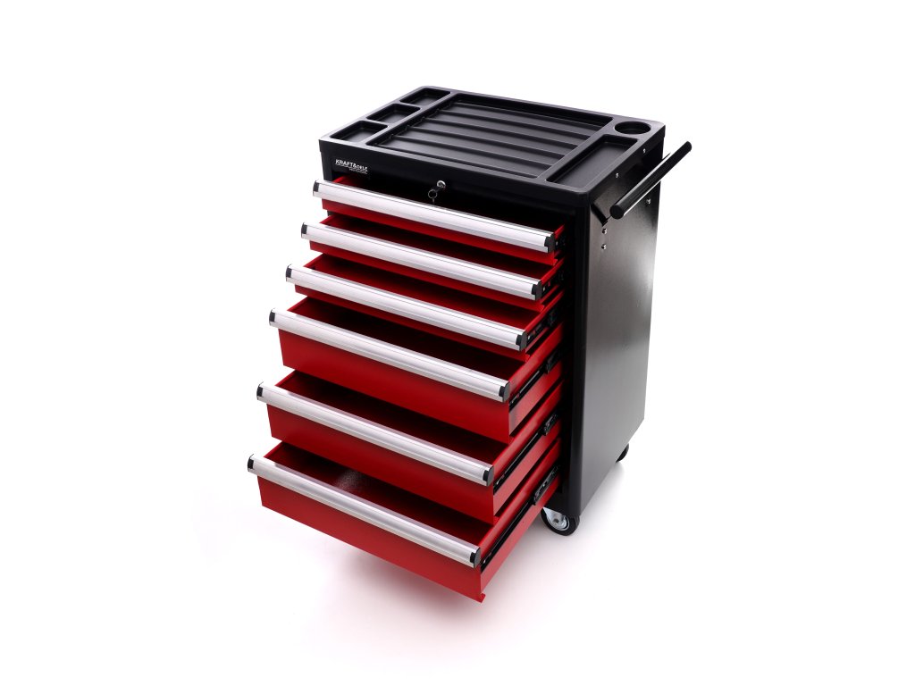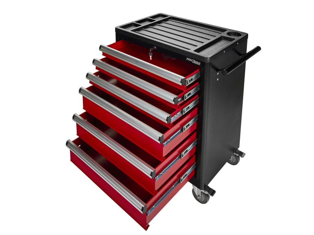 Vozík KD370 je vybaven šesti prostornými zásuvkami pro efektivní uspořádání nářadí. Tři menší zásuvky jsou ideální pro drobnější nástroje, zatímco tři hluboké spodní zásuvky pojmou větší dílenské vybavení. Každá zásuvka je osazena na ložiskových pojezdech, což zajišťuje jejich plynulé, tiché a bezproblémové otevírání a zavírání po dlouhou dobu.