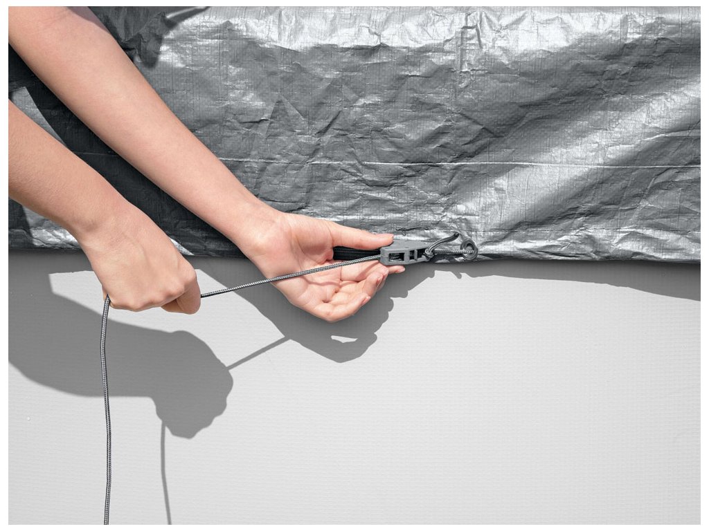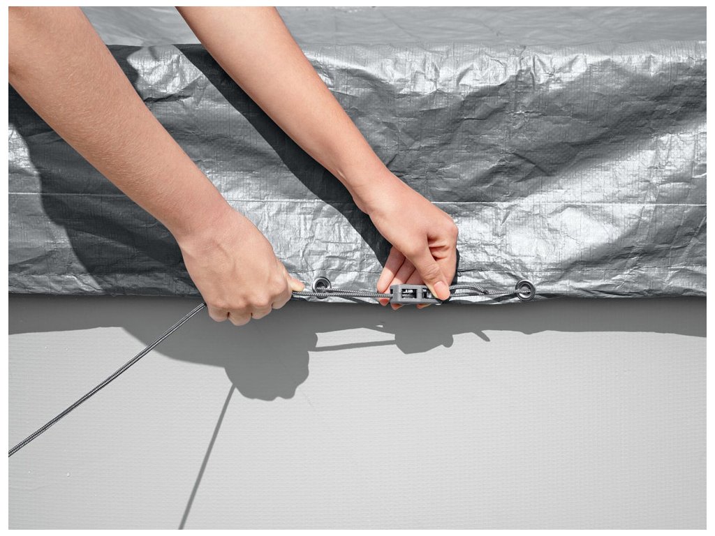 Stabilní upevnění zajišťuje větruodolný upínací mechanismus, který spolehlivě udrží plachtu na místě i za nepříznivých povětrnostních podmínek. Speciální drenážní otvory chytře zabraňují hromadění dešťové vody na povrchu, což zvyšuje funkčnost plachty a usnadňuje její každodenní manipulaci. Pro optimální výkon a dlouhou životnost je důležité plachtu nasazovat v souladu s linií bazénu, při hladině vody nejméně 90 % doporučeného naplnění.