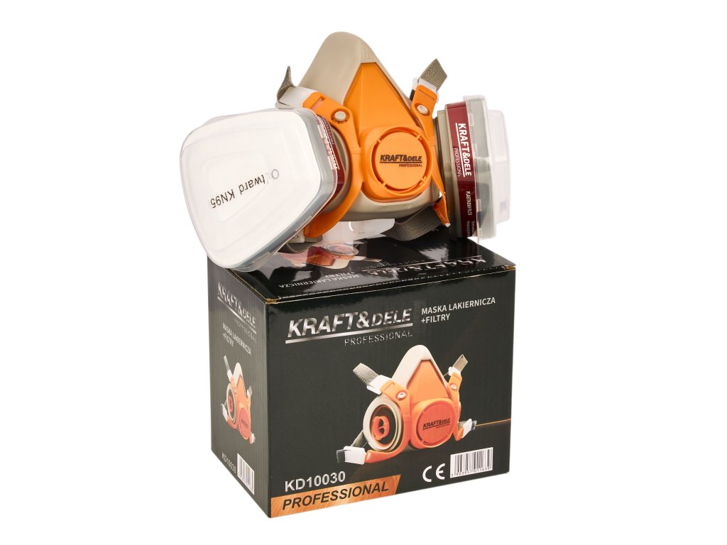 Profesionální opakovaně použitelná lakovací maska KD10030 je ekonomický produkt, nevyžaduje údržbu a snadno se používá. Systém popruhů zajišťuje perfektní přizpůsobení každé hlavě. Konstrukce masky snižuje omezení zorného pole. Maska byla vyrobena tak, aby poskytovala ochranu dýchacích cest a před různými nebezpečími, jako jsou výpary, mlhy, plyny, prachy a aerosoly. Snadné použití. Používají ji amatéři i profesionálové v lakovnách atd.