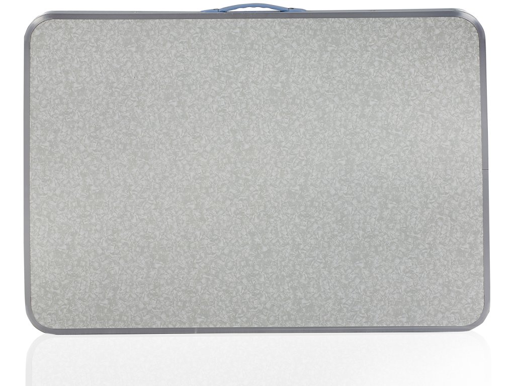 - Ve sbaleném stavu je stůl snadno transportovatelný v podobě ploché desky s uchem