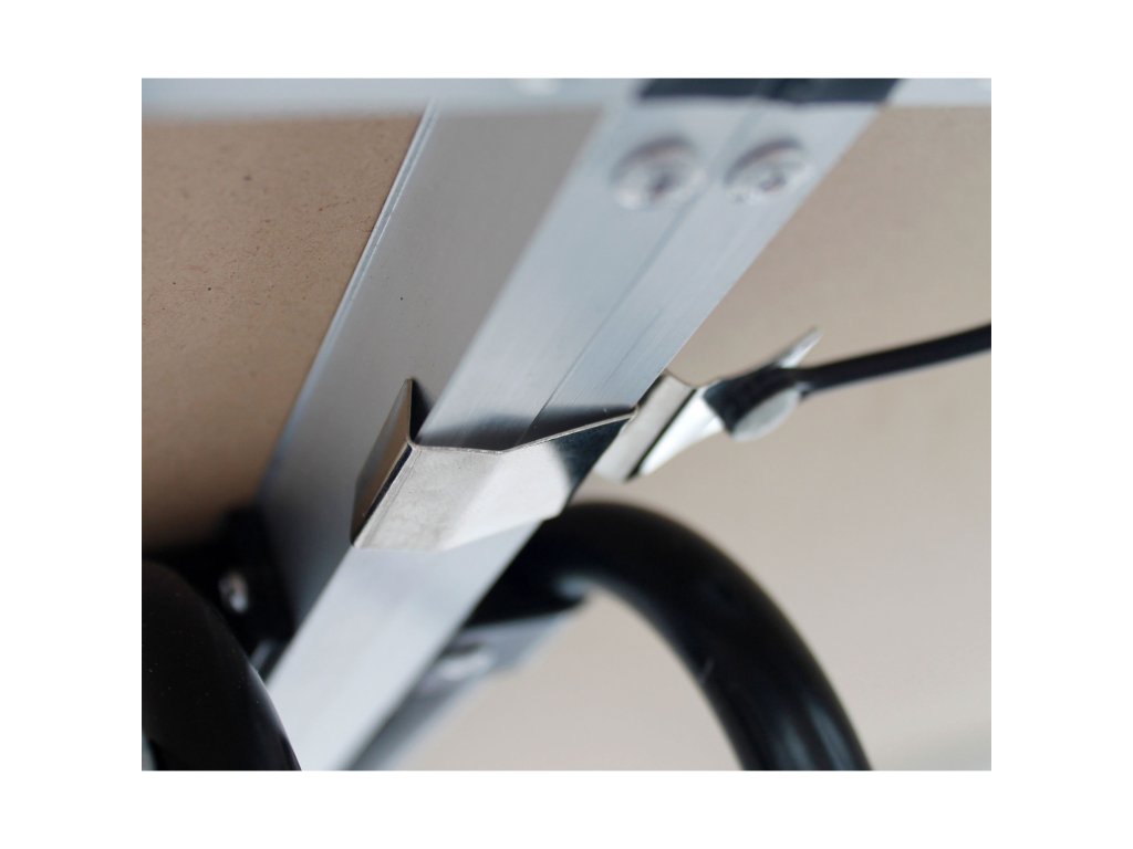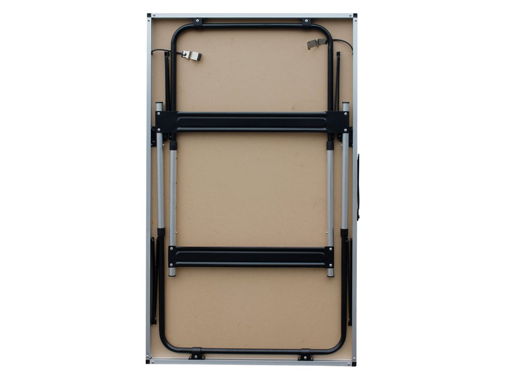 - Ve sbaleném stavu je stůl snadno přenosný v podobě ploché desky s uchem