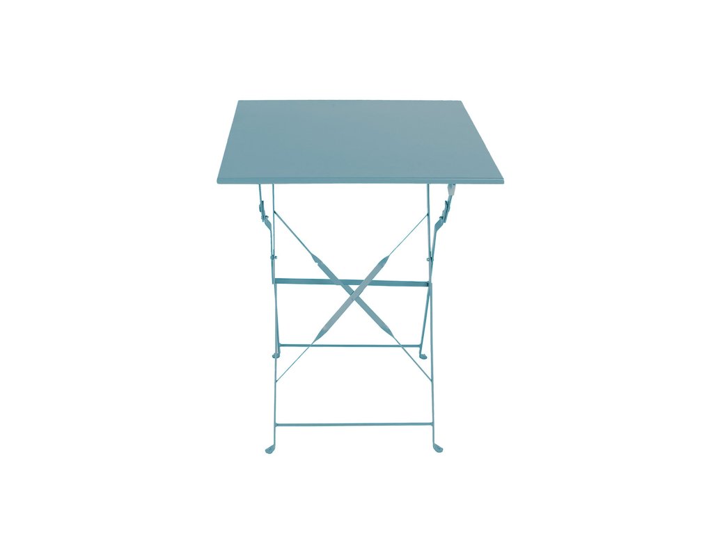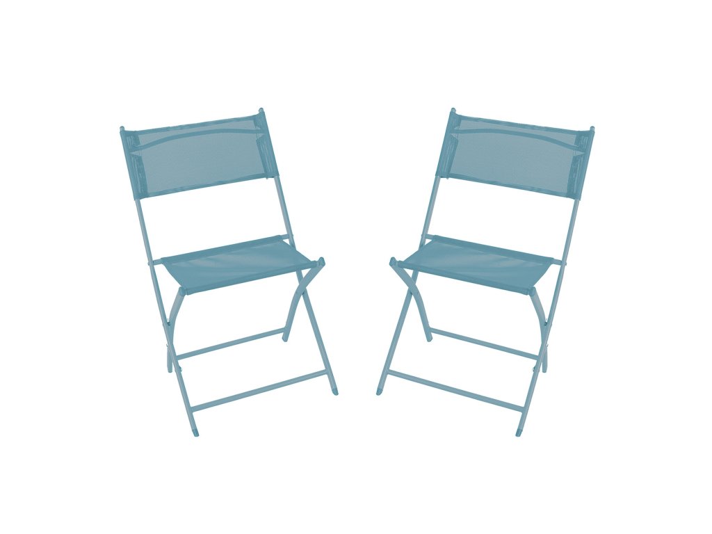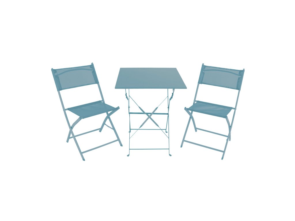 Sestava zahrnuje 2 křesla a stůl v modré barvě. Zahradní stolek má kovový rám a skládací mechanismus kostry, díky tomu můžete stolek velmi rychle rozložit nebo složit.
