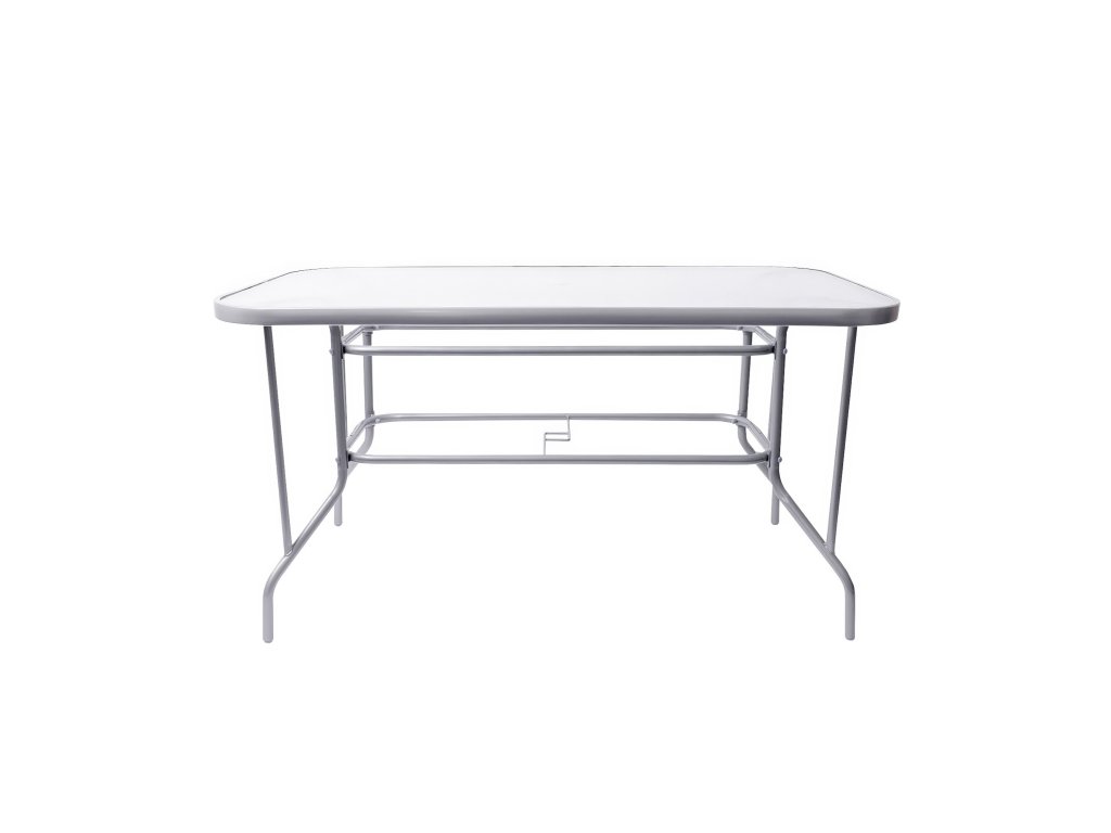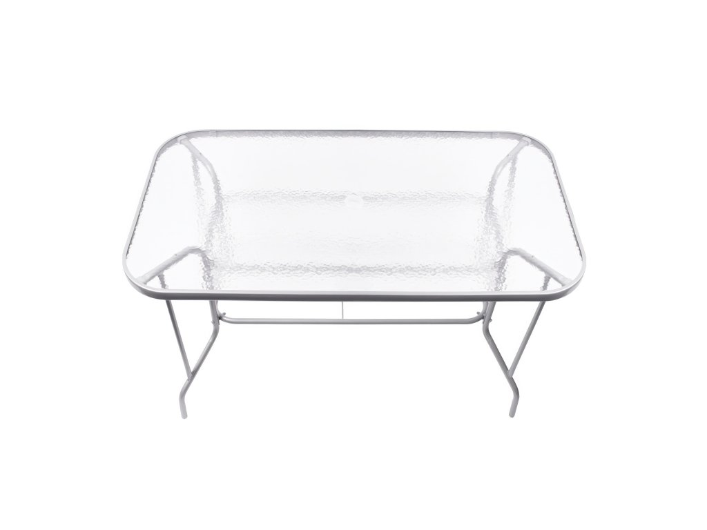 Zahradní stůl MILANO s pevným kovovým rámem a texturovanou skleněnou deskou v moderním designu, vhodný pro zahrady, terasy, kavárny, altánky, balkóny či pláže.