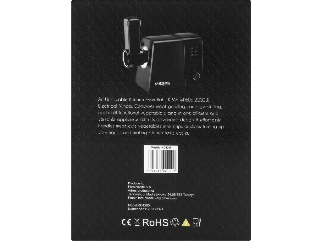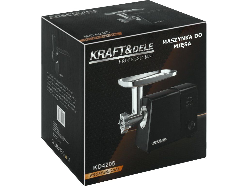 KD4205 to wydajna i funkcjonalna maszynka do mielenia mięsa marki KRAFT&DELE, która doskonale sprawdzi się w każdej kuchni. Dzięki mocy 2200 W urządzenie pozwala szybko i sprawnie przygotować mięso na domowe potrawy, takie jak kotlety, pasztety czy farsze, zapewniając wygodę oraz oszczędność czasu.