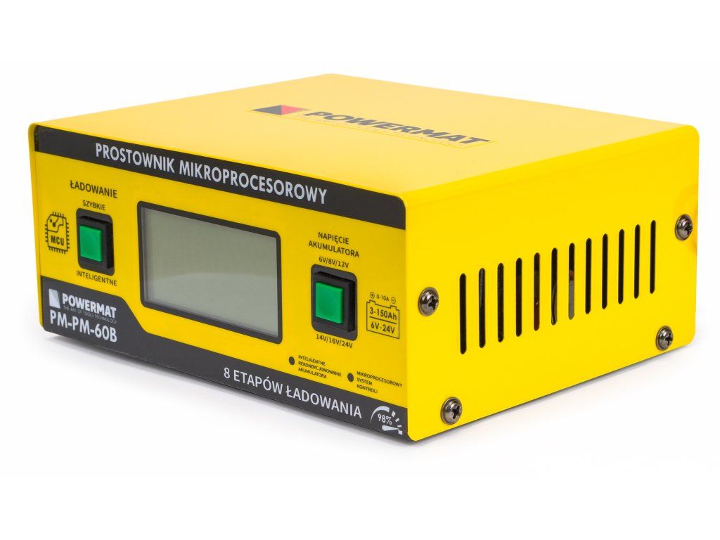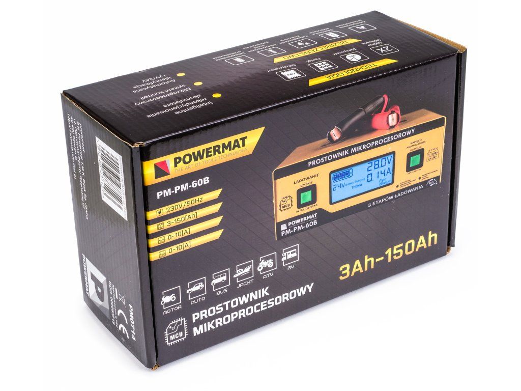 Moderní technologie nabíjení PWM pomocí MCU. Nabíječka PM-PM-60B značky Powermat je první nabíječka akumulátorů na trhu s mikroprocesorovým systémem kontroly a řízení v technologii PWM s možností nabíjení akumulátorů do 24V a možností výběru nestandardních typů napětí akumulátorů, která inteligentně a konkrétně vybere vhodné parametry, čímž zregeneruje váš vybitý a zanedbaný akumulátor. Inteligentní rekondicionování akumulátoru probíhá nepřetržitým testem systému a přepínáním nabíjení ve 4 režimech (Constant Voltage; Constant Current; Trickle Charge Modulation; Floating Charge Modulation). Nabíjení v inteligentním (SMART) nebo rychlém (FAST) režimu nevyžaduje vaši pozornost, neboť všechny programy řídící proces nabíjení byly velmi přesně navrženy pro odpovídající typy akumulátorů a jejich jmenovitá napětí za účelem co nejpřesnějšího uvedení do ideální kondice. PWM (ang. Pulse-Width Modulation) – je metoda regulace proudového nebo napěťového signálu s konstantní amplitudou a frekvencí, spočívající ve změně střídy signálu. Systém PWM napájí zařízení přímo nebo přes dolní propust, která vyhlazuje změny intenzity elektrického proudu a napětí. Zobrazení parametrů nabíjení umožňuje dodatečnou kontrolu stavu vašeho akumulátoru. Velký displej informuje o aktuálním proudu, režimu nabíjení a aktuálním napětí akumulátoru. Navíc lze pozorovat stav nabití v procentech. Velmi vysoká účinnost nabíjení při kladných teplotách. Díky pokročilému řízení nabíjecích procesů je účinnost nabíječky 98%, což ji činí nesrovnatelnou s tradičními typy nabíječek bez tohoto druhu technologie.