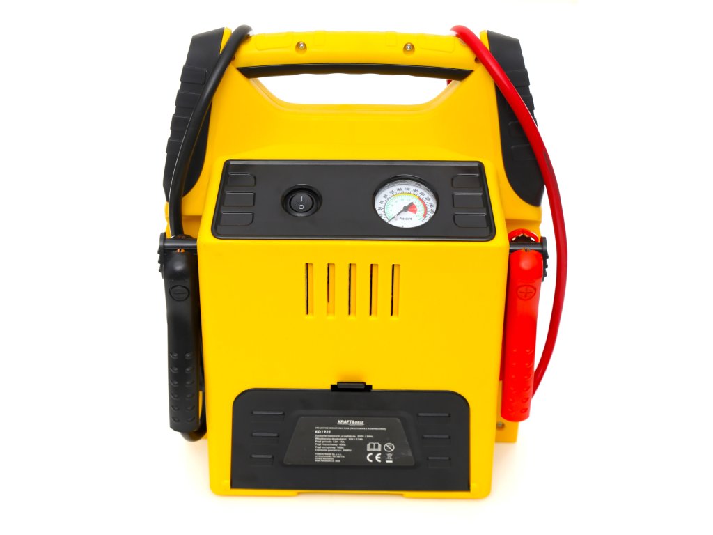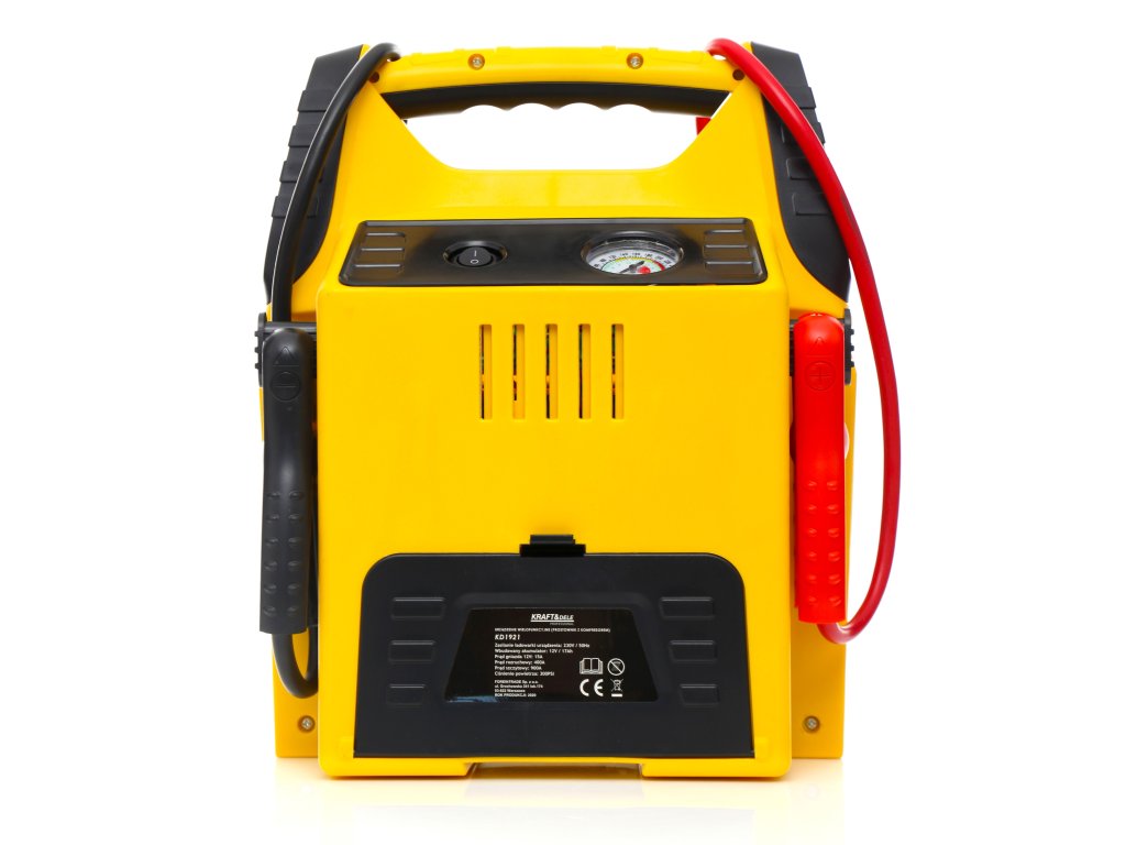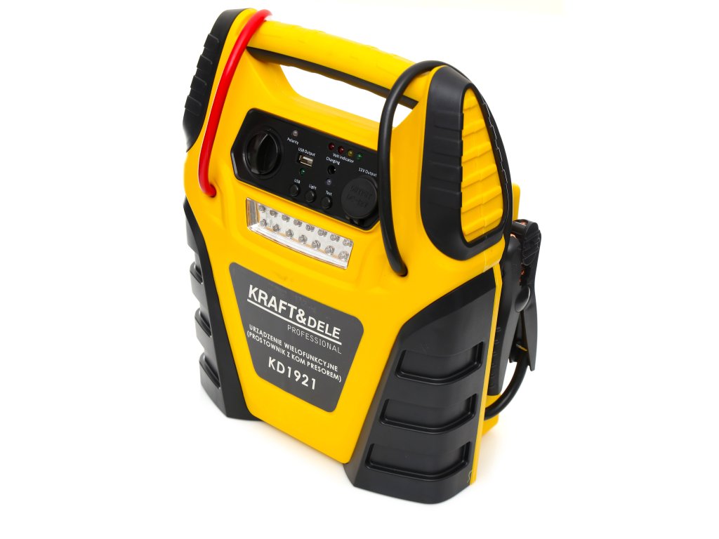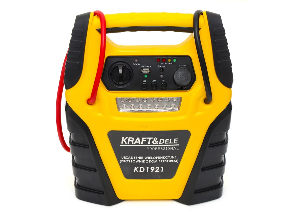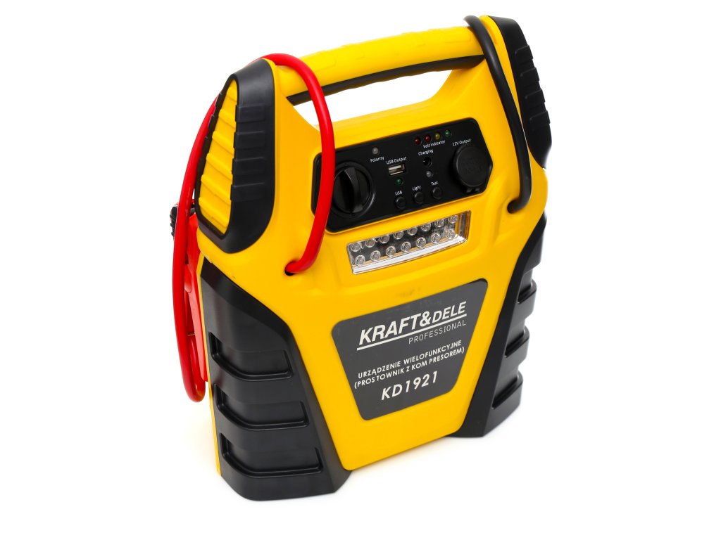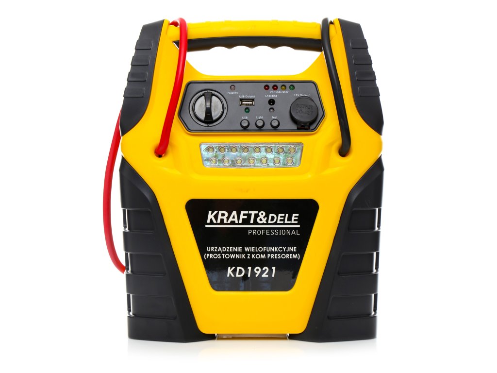 Multifunkční startovací zařízení KD1921 je nepostradatelným pomocníkem pro každého řidiče. Kompaktní, přesto výkonný pomocník kombinuje čtyři funkce v jednom zařízení: umožňuje nastartování vozidla, nabíjení mobilních zařízení přes USB, osvětlení prostoru pomocí LED lampy a nafukování pneumatik nebo sportovních potřeb díky vestavěnému kompresoru. Zařízení má vestavěné startovací kabely (65 cm) a hadici kompresoru (55 cm), a je vybaveno ochranou proti přetížení. Vše je kompaktně zabaleno a připraveno k použití doma i na cestách.