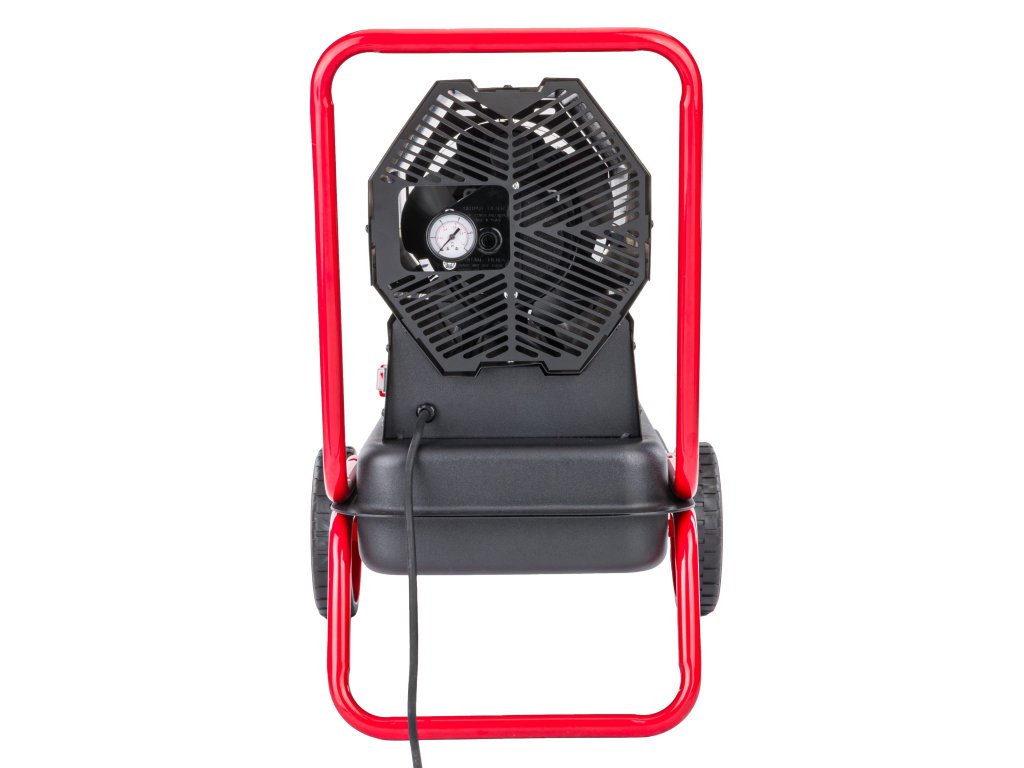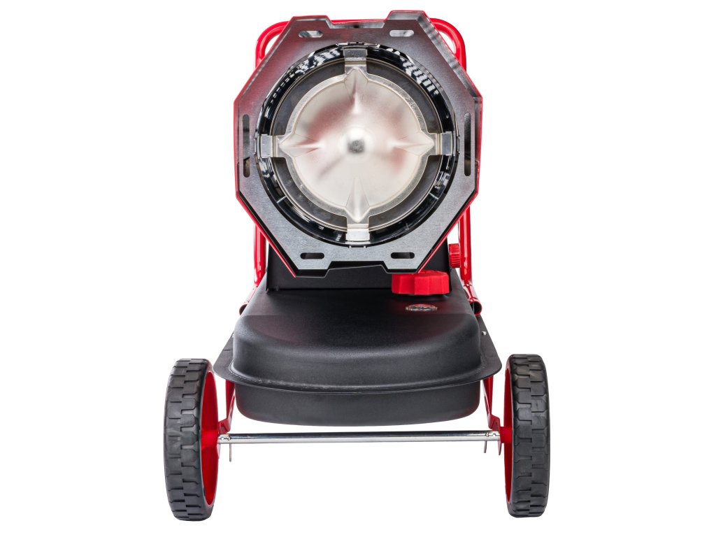 Zařízení je vybaveno výkonným 5-lopatkovým ventilátorem, který zajišťuje rovnoměrné šíření tepla s průtokem 920 m³/h. Bezpečnostní systém zahrnuje piezoelektrické zapalování, ochranu proti přehřátí a kontrolu tlaku paliva. Praktický indikátor hladiny paliva umožňuje rychlou kontrolu nádrže během provozu.
