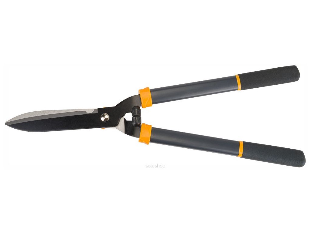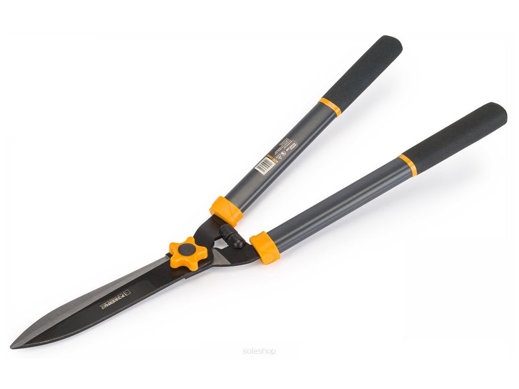 Nůžky na živý plot značky POWERMAT s noži vyrobenými z oceli, která poskytuje odpovídající tvrdost a umožňuje přesné a snadné stříhání. Rukojeti zahradnických nůžek jsou vyrobeny z gumy, což zajišťuje pevný a pohodlný úchop i mokrýma a kluzkýma rukama