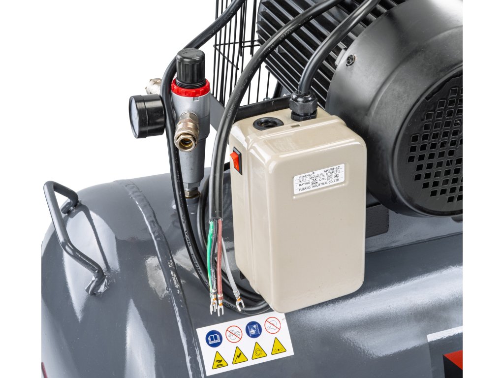 Tlakový spínač je nastaven na maximální tlak 8 bar, když tlak v nádrži dosáhne této hodnoty, kompresor se vypne a znovu se zapne, když tlak v nádrži klesne pod 6 bar.