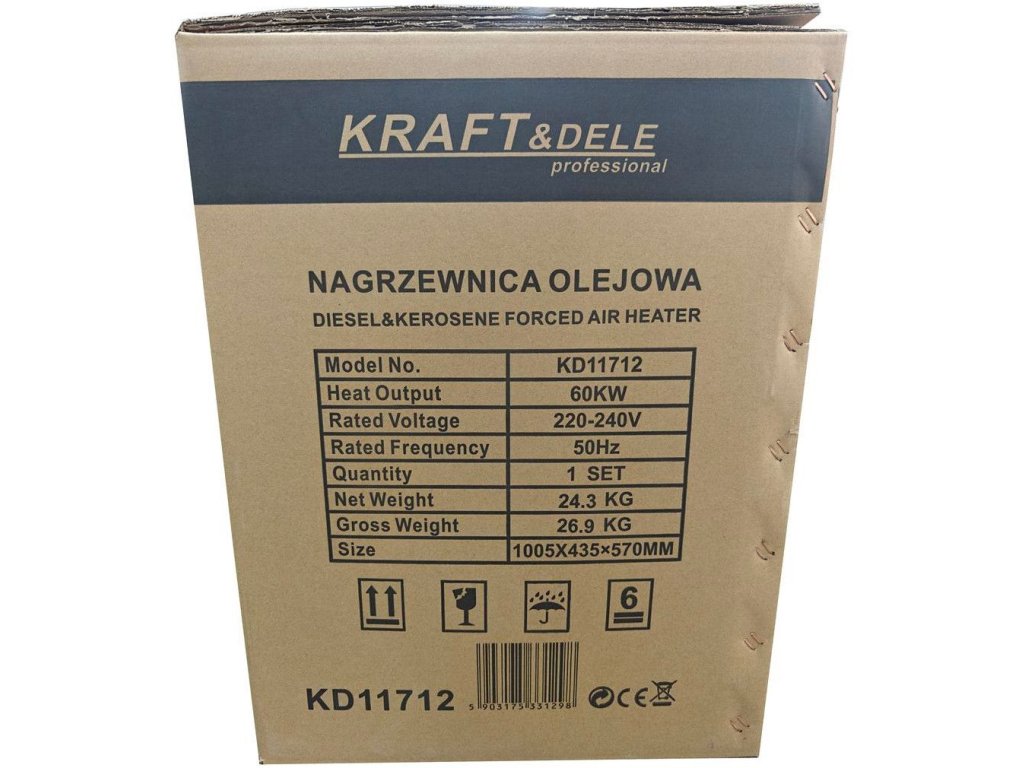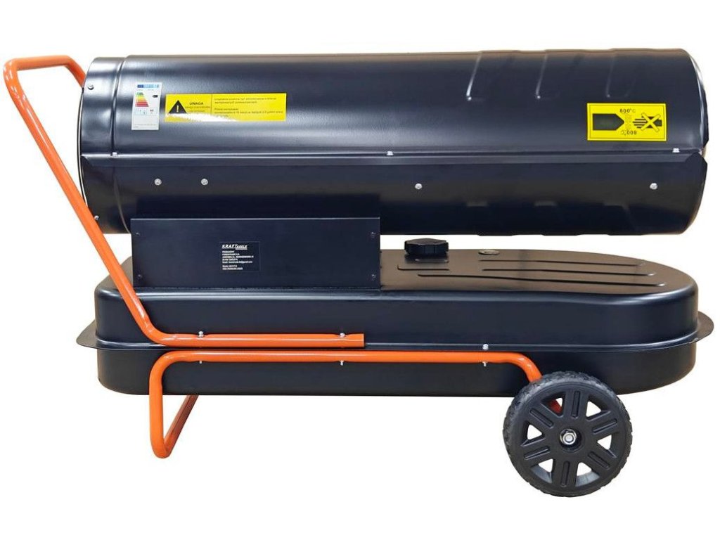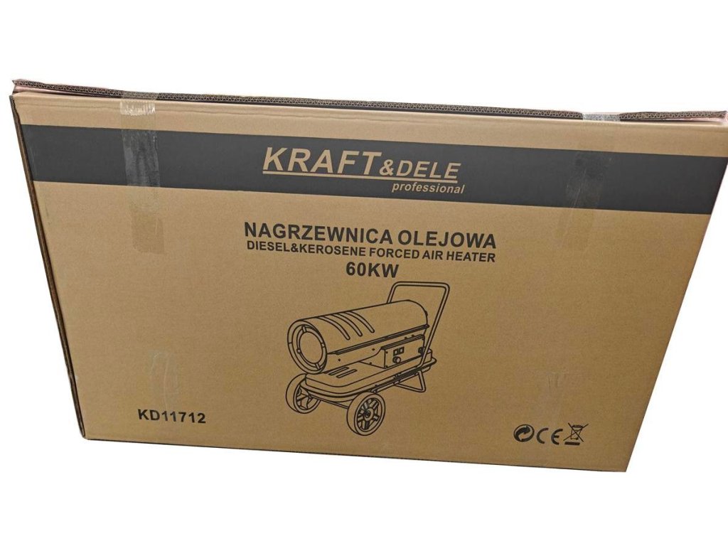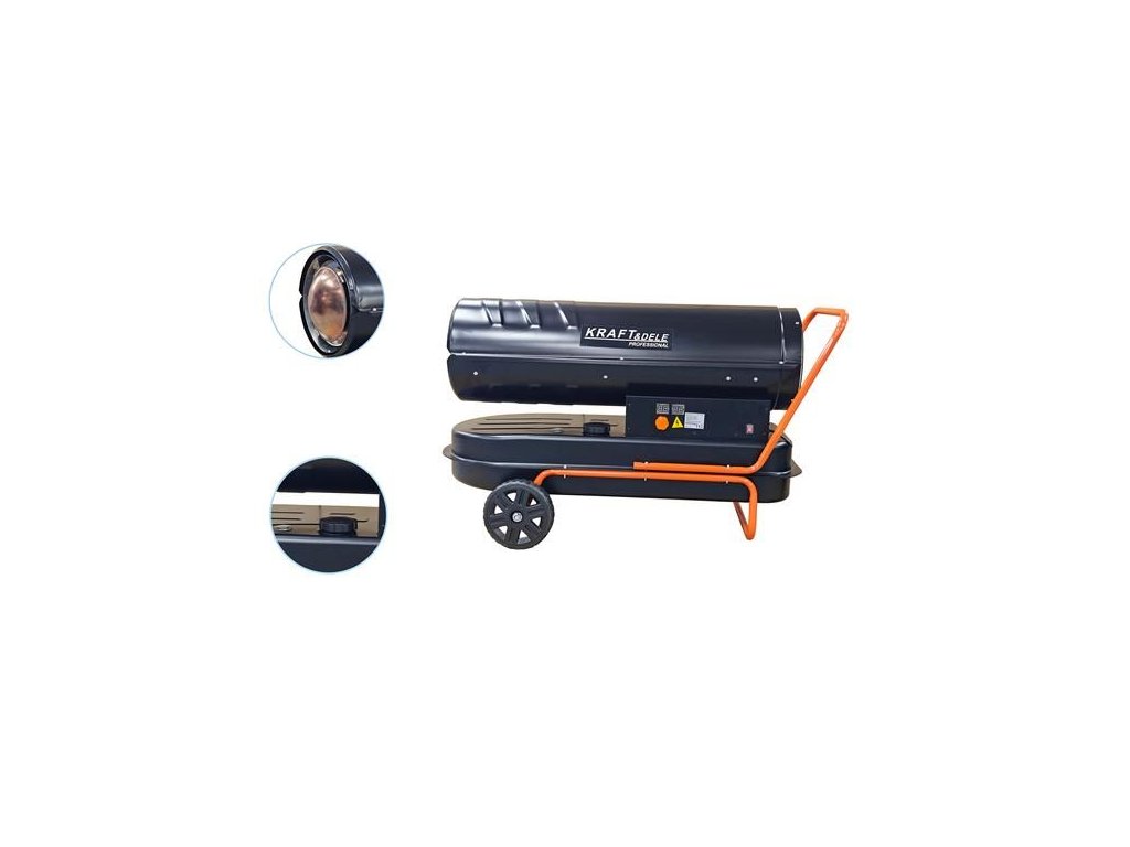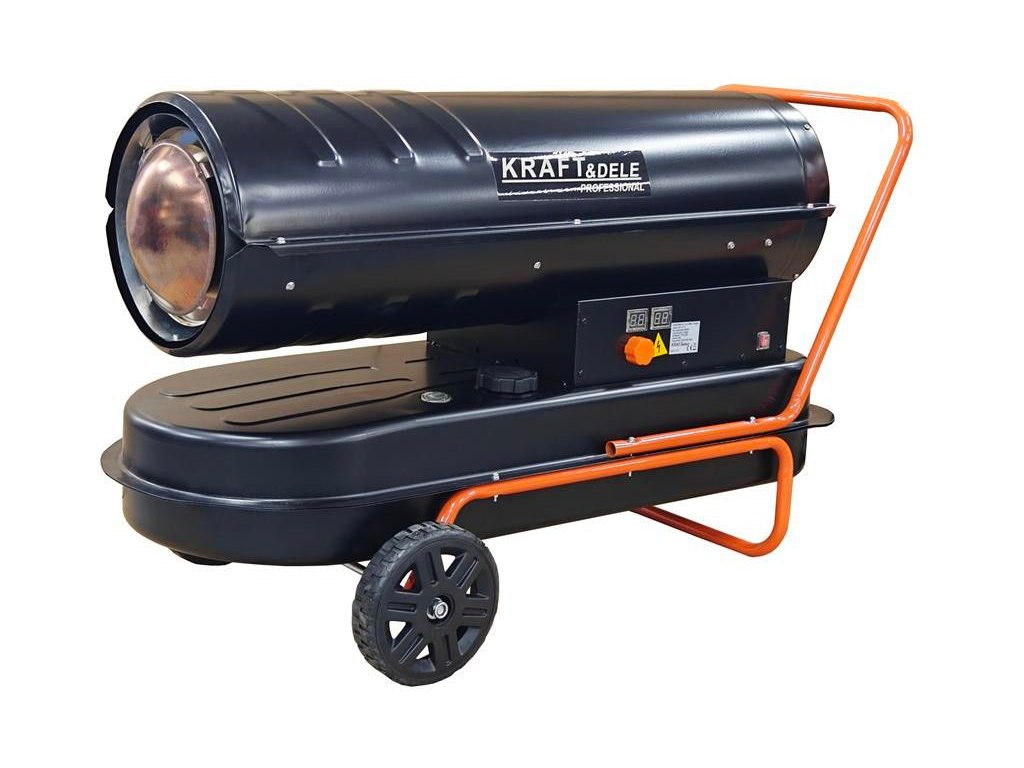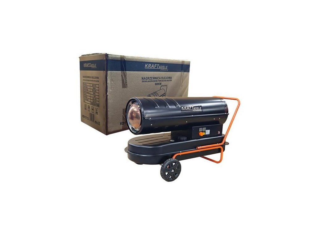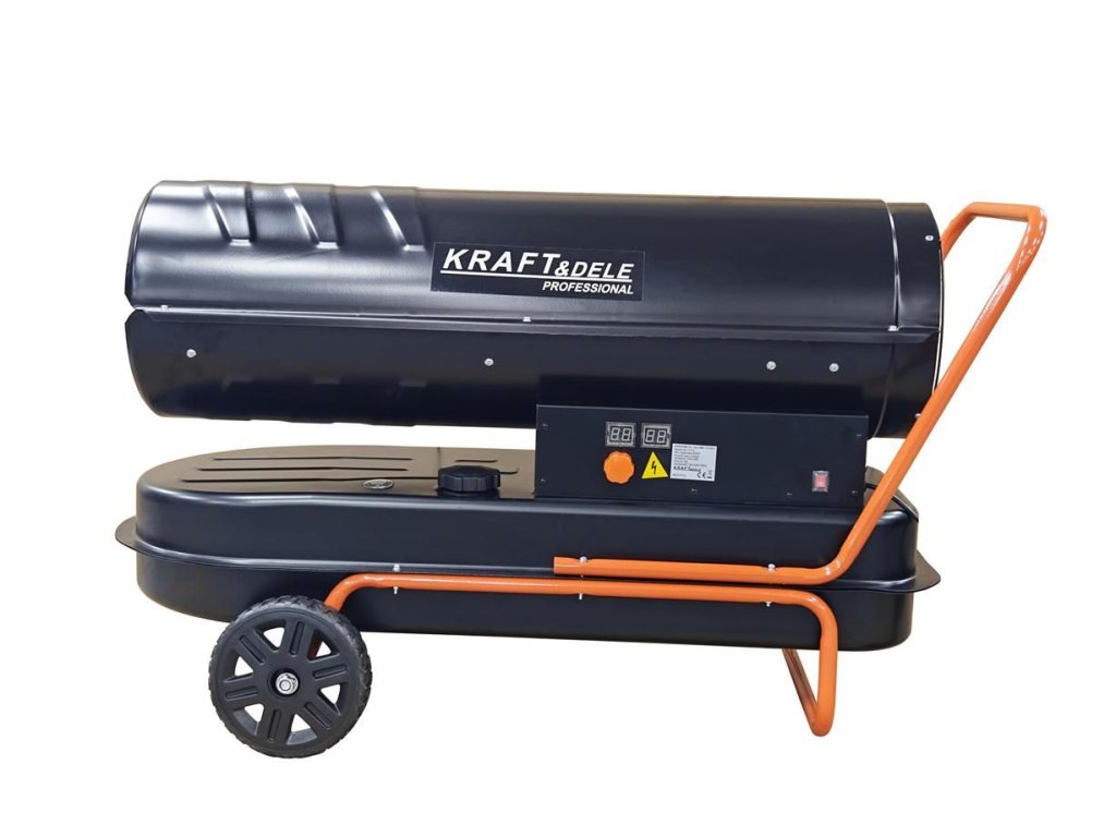 Ohřívač KD11712 s výkonem 60 kW, poháněný naftou. Ohřívač má vestavěný termostat s regulací teploty a digitální displej, který umožňuje snadné nastavení požadované okolní teploty. Ohřívač pracuje automaticky v závislosti na nastavené teplotě. Ohřívače Kraft & Dele patří k nejlepším zařízením na trhu ve své cenové relaci. Jejich speciálně navržená spalovací komora zajišťuje vysokou účinnost s maximální úsporou paliva. Tato zařízení se široce používají ve stavebnictví, skladech, chovu zvířat, domácnostech, chatkách a všude jinde, kde je zajištěno řádné větrání. Toto bezpečné, odolné a snadno použitelné zařízení.