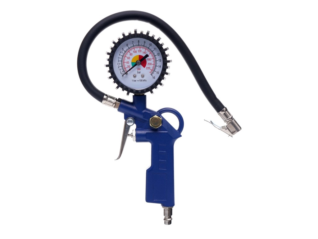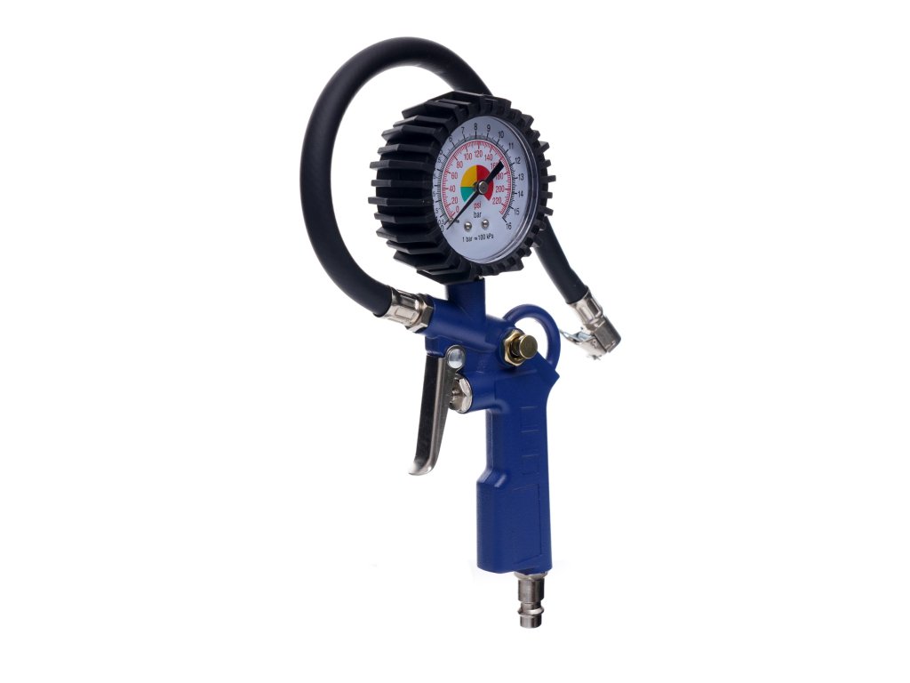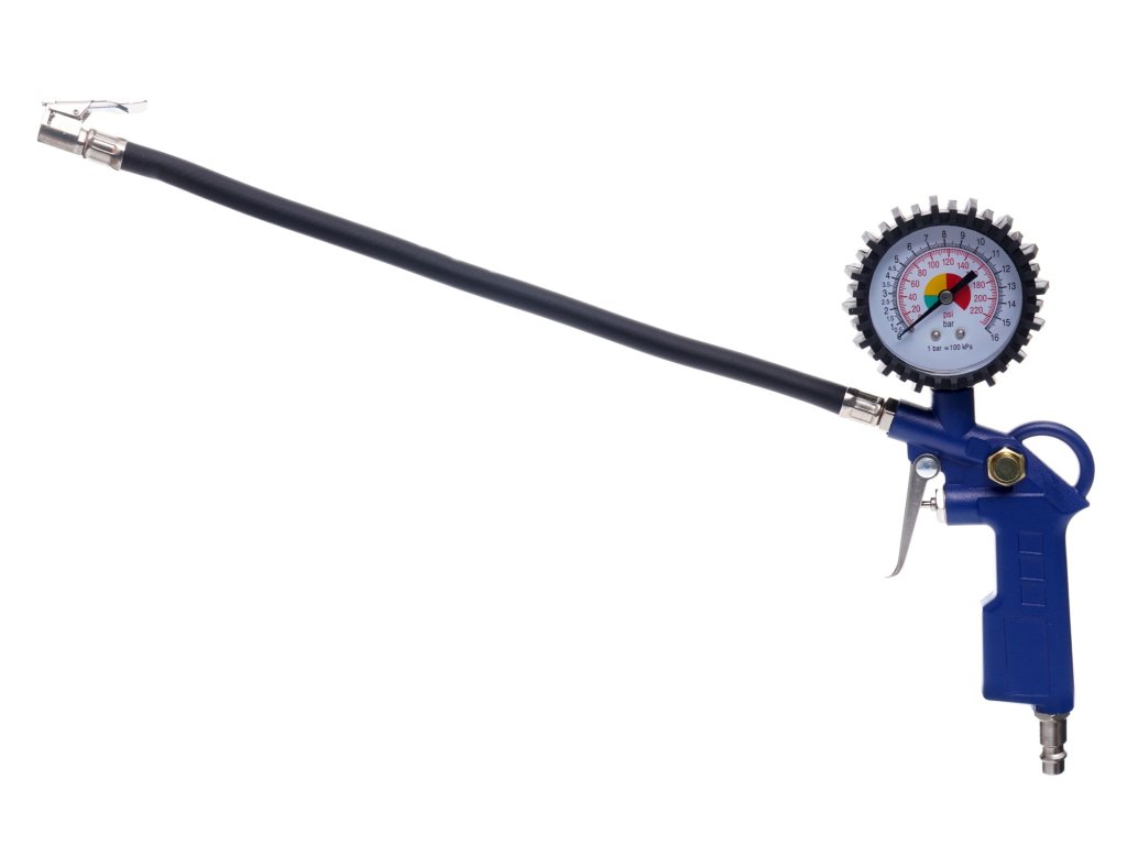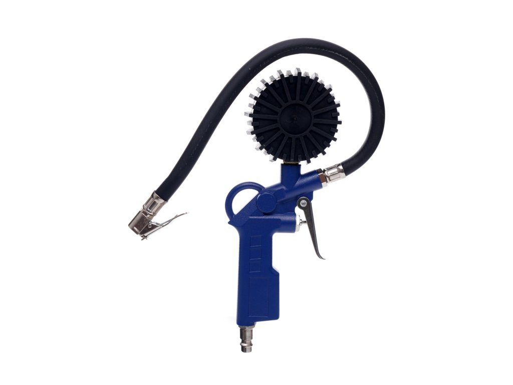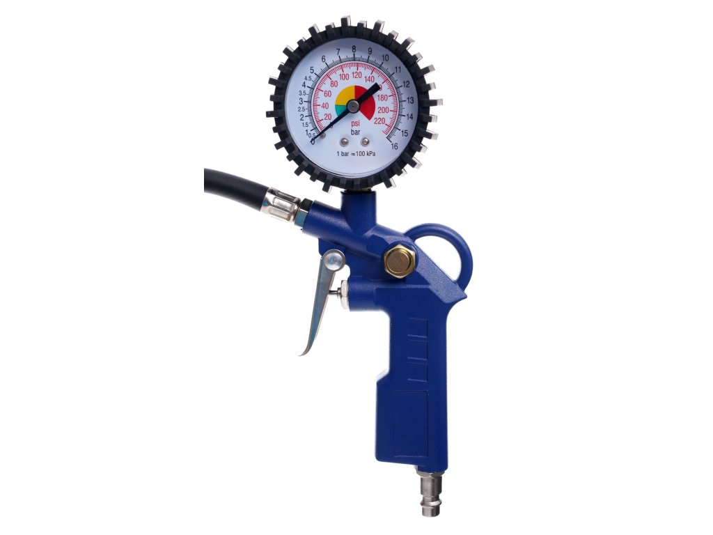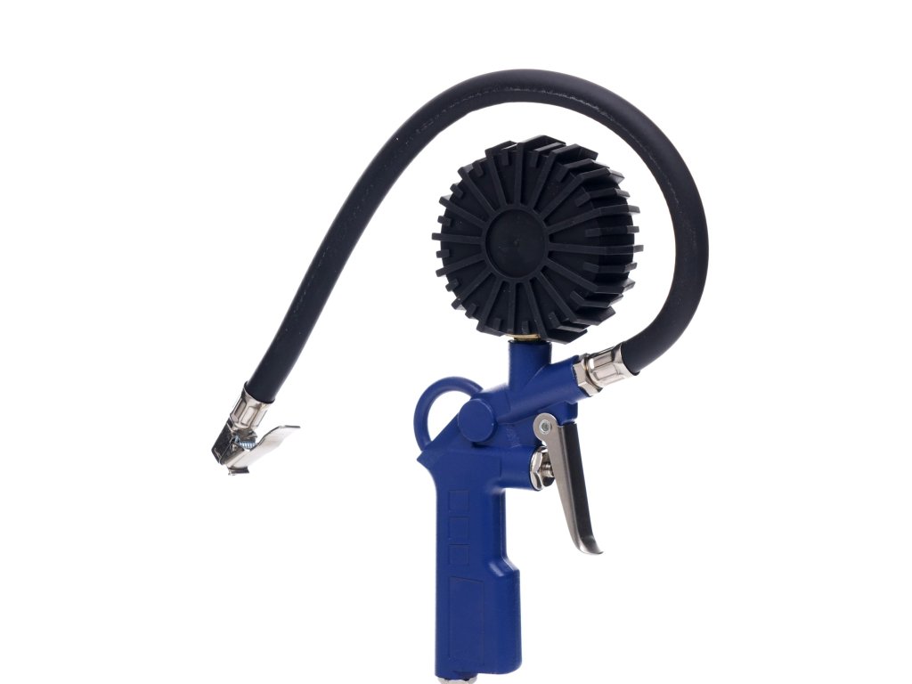 Pistolet do pompowania z manometrem Pistolet do pompowania z manometrem jest doskonały do pompowania i kontroli ciśnienia ogumienia pneumatycznego. Posiada gumową obudowę zegara. Wyposażony jest w zawór spustowy powietrza.