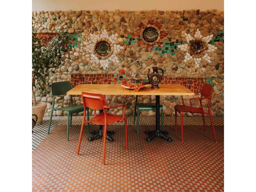Zahradní křeslo Rimo je kombinací klasické formy s moderní, výraznou červenou barvou inspirovanou pálenými cihlami. Má jemné zakřivené linie, které mu poskytují elegantní vzhled, zatímco ergonomické sedadlo a optimálně tvarované područky zajišťují pohodlí při používání. Díky použití 100% recyklovatelných materiálů je Rimo ekologickou alternativou tradičního dřevěného nábytku. Další výhodou je možnost stohování, která usnadňuje skladování a gumové násadky na nožky, které zajišťují stabilitu a chrání podlahu před poškrábáním. Křeslo je vyrobeno z lehkých, ale extrémně odolných materiálů a je vhodné pro vnitřní i venkovní prostory.