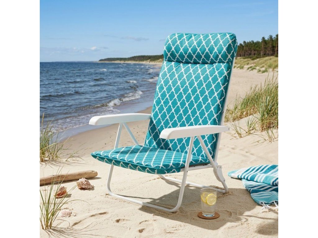 Plážové křeslo má rám nastavitelný do 28 pozic. Rám je malovaný práškovou barvou, má čtvercové opěradlo. Skvělý doplněk na pláž, cemping, na zahradu. Konstrukce je z ocelových trubek fi 18 mm. Po složení nezabírá mnoho místa. Horní část sedáku je vyrobena z polyesterovo-bavlněné tkaniny, spodní část je vyrobena z polypropylenu, lemovaná barevným polyesterovým lemem. Profilovaná opěrka hlavy - váleček. Typ výplně sedáku: polyuretanová pěna o tloušťce 2,5 / opěrka váleček 5,5 cm. V horní části opěradla a ve spodní části sedadla je kapsa pro připevnění k rámu. Na opěradle je příčné prošívání oddělující opěrku hlavy. Výplň: polyuretanová pěna MAXIMÁLNÍ ZATÍŽENÍ: DO 110 KGTechnické parametry: