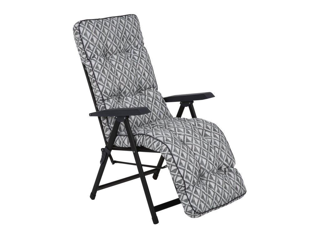 Zahradní křeslo Lena Plus Black Edition s hrubým pohodlným sedákem vám zaručí dokonalý odpočinek. Moderní geometrický vzor sedáku v šedém barevném provedení dokonale zapadne do jakéhokoliv aranžmá. Rám křesla je možné nastavit do 28 poloh. Rám je vyrobený z ocelových trubek a je práškově lakovaný matnou černou barvou, odolnou proti poškrábání a povětrnostním vlivům. Pohodlné posezení je zaručeno díky prošívanému sedáku typu Box Model. Sedák je vyplněný řezanou houbičkou flocke, která poskytuje měkkost a podporu. Vrchní část sedáku je z bavlněno-polyesterové tkaniny (48% bavlna, 52 % polyester), spodní část je z polypropylenu. Praktická kapsa v horní části opěradla a gumový pásek ve spodní části zaručují jednoduché a stabilní připevnění k rámu.