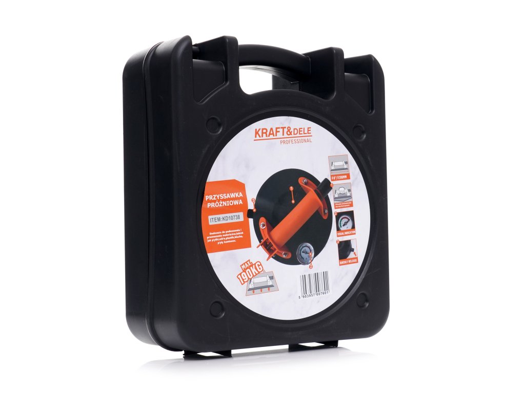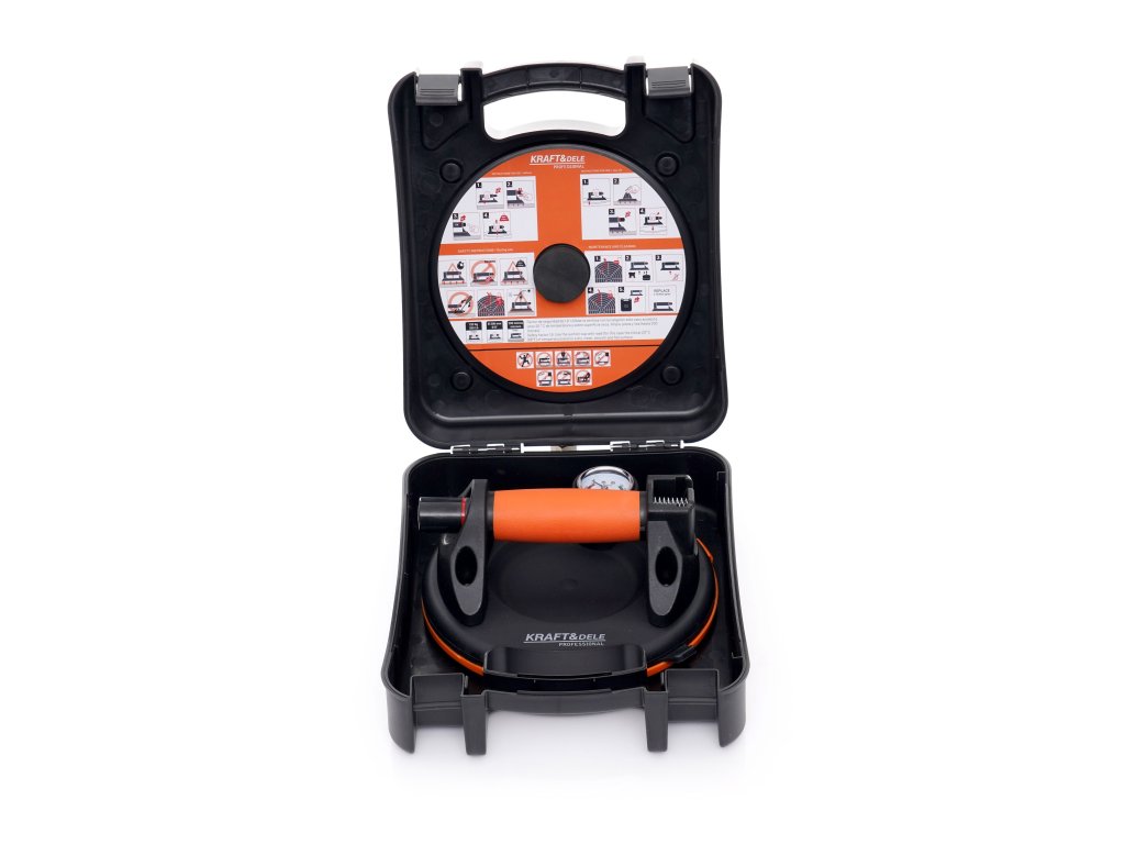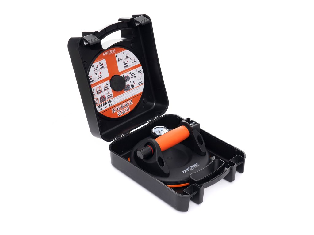 Přísavka na sklo a obklady podtlaková s manometrem je vybavena vakuovou pumpou pro pevnější uchopení a tlačítkem pro rychlé uvolnění. Je určena pro přenášení různých předmětů s hladkým povrchem, jako jsou skla, okna, autoskla, plechy, lamináty apod., jejichž hmotnost nepřesahuje 190 kg. Hliníkové tělo a gumová přísavka zajišťují bezpečné a spolehlivé přenášení těchto předmětů. Díky širokému spektru využití je ideální pro profesionály i amatéry. Zařízení je baleno v praktickém kufříku.