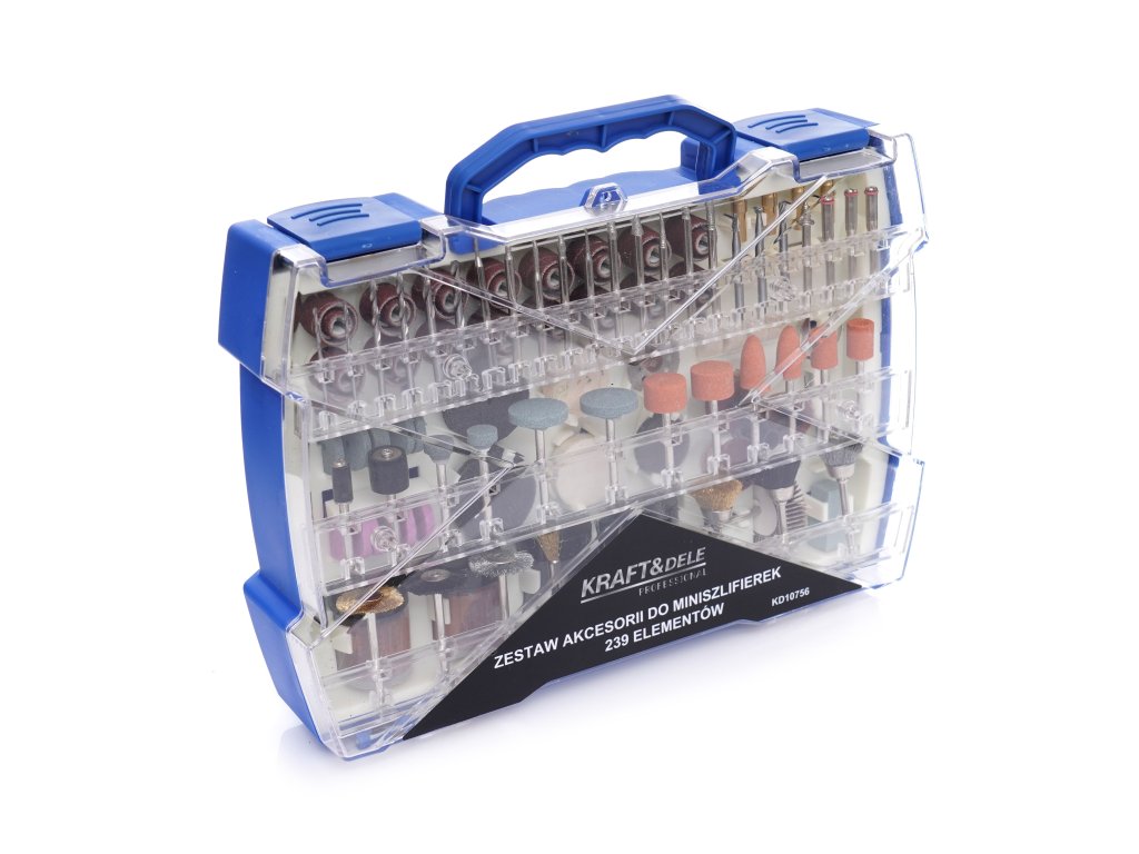 Příslušenství pro mini brusku sada 239 kusů je určena pro různé účely. Sada obsahuje příslušenství, které vám umožní provádět činnosti jako: řezbářství, gravírování, broušení, čištění, leštění, řezání a mnoho dalších. Vše je v pevném a pohodlném kufru.