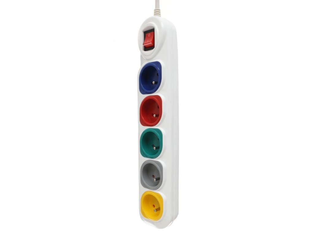 Prodlužovačka má 5 zásuvek, které jsou barevně odlišené, s centrálním vypínačem, jakož i s přepěťovou ochranou.