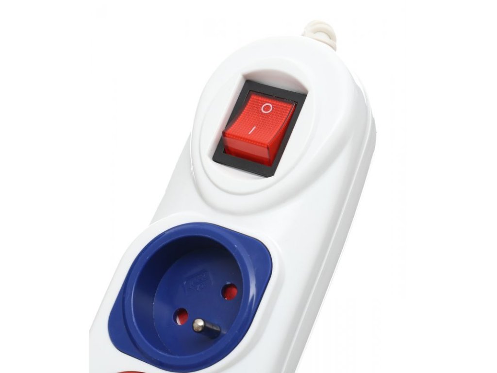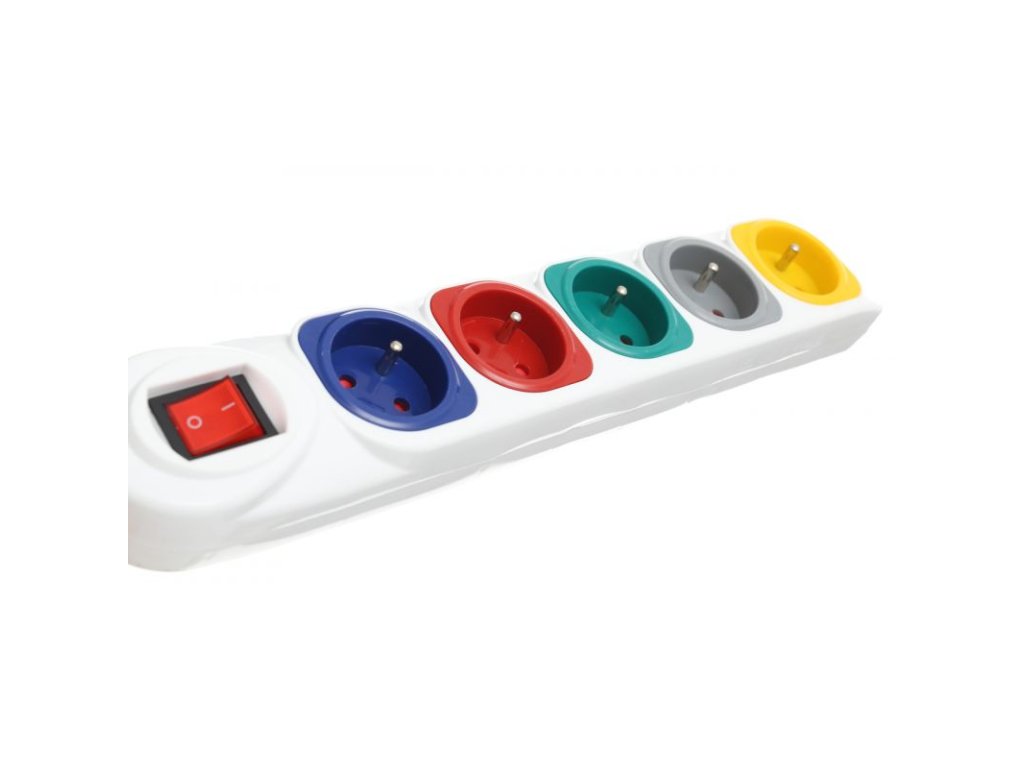 Prodlužovačka má 5 zásuvek, které jsou barevně odlišené, s centrálním vypínačem, jakož i s přepěťovou ochranou.