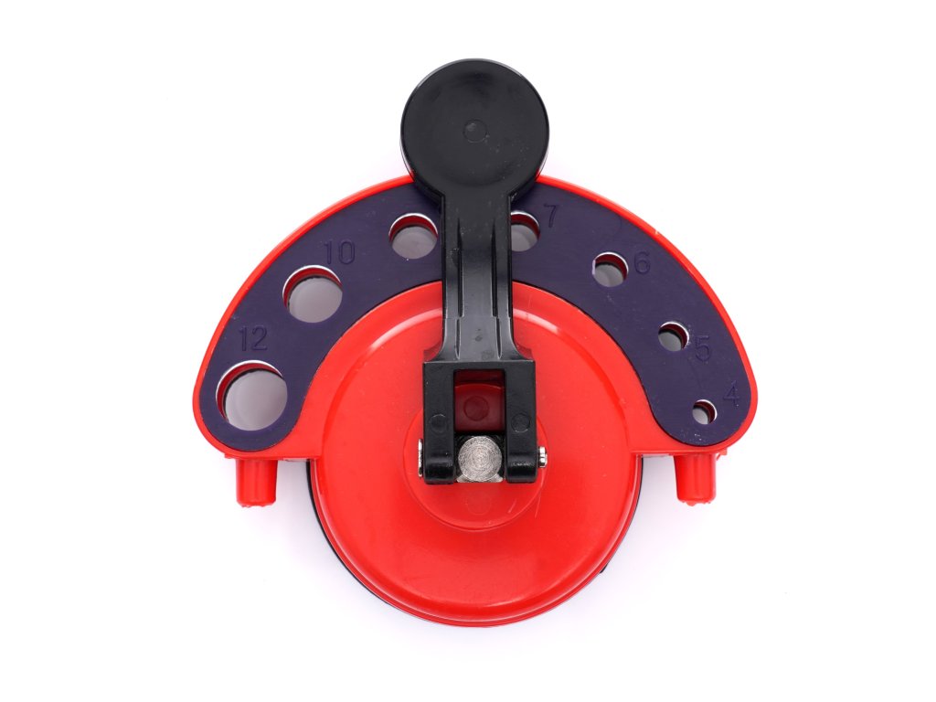 Prowadnica wykonana z wytrzymałego tworzywa ABS obsługuje wiertła w rozmiarze 4-12 mm. Posiada mocną przyssawkę o średnicy aż 6 cm i 7 otworów prowadzących o średnicach: 4, 5, 6, 7, 8, 10, 12 mm.