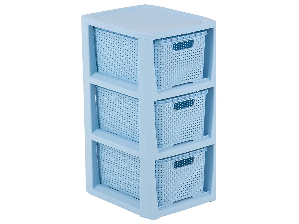 Regál Rattan se třemi koši (každý o objemu 7 l) , které plní funkci šuplíků je skvělým způsobem na přechovávání nezbytných doplňků v koupelně, šatně nebo v ložnici. Je vyroben z vysoce kvalitního plastu odolného proti vlhkosti. Lehká konstrukce umožňuje snadné přemístění. Konstrukce košíků imituje rattanový splot. Hladký povrch vevnitř neponičí uložené předměty. Regál jednoduše udržíte v čistotě, stačí ho přetřít vlhkým hadříkem.
