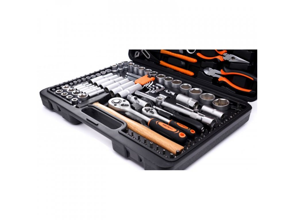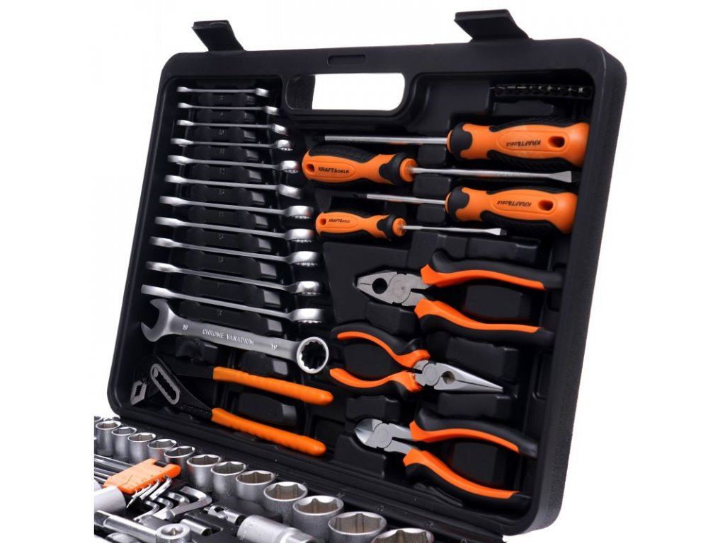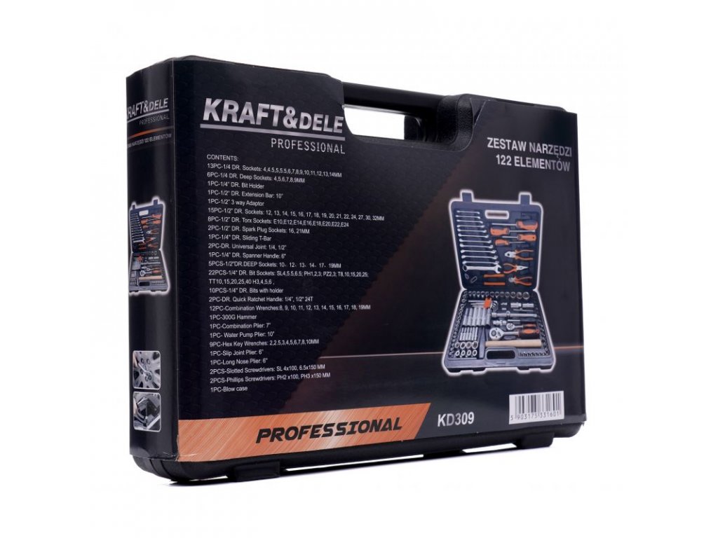 Profesionální sada klíčů značky Kraft & Dele KD309 se skládá ze 122 ks, které se vyznačuje vysokou mechanickou pevností. Prvotřídní, rozsáhlá sada speciálně doporučená pro mechanické a automobilové služby, stejně jako pro kutily.