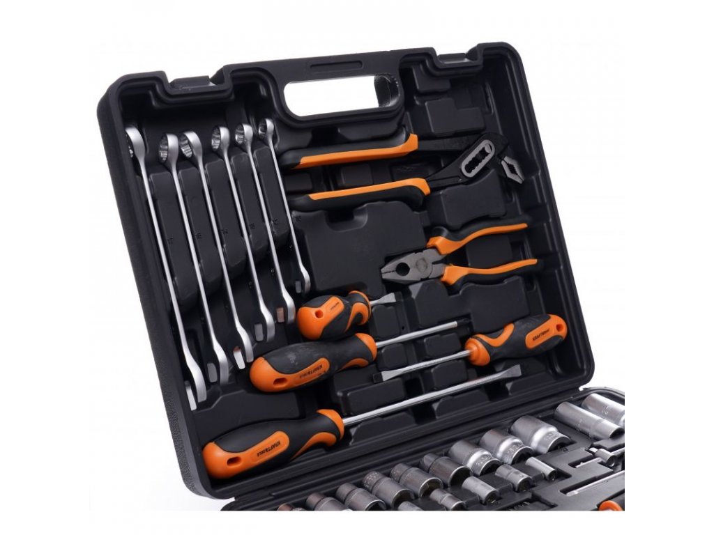 Kufr vyrobený z odolných plastů umožňuje udržovat pořádek a snadné přenášení nářadí. Každý nástroj má určené místo, kde je snadné najít požadovanou velikost klíče.