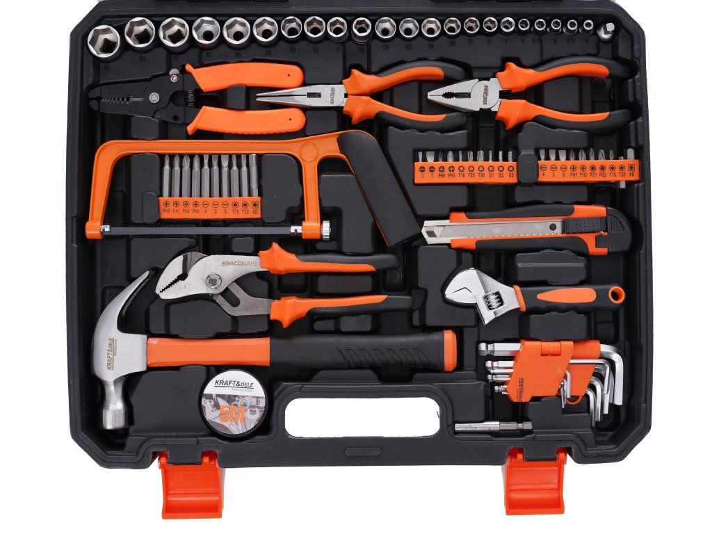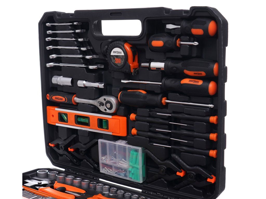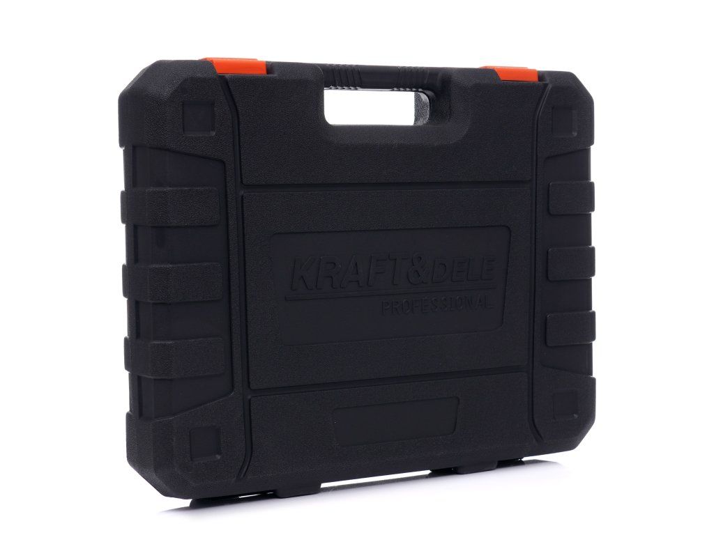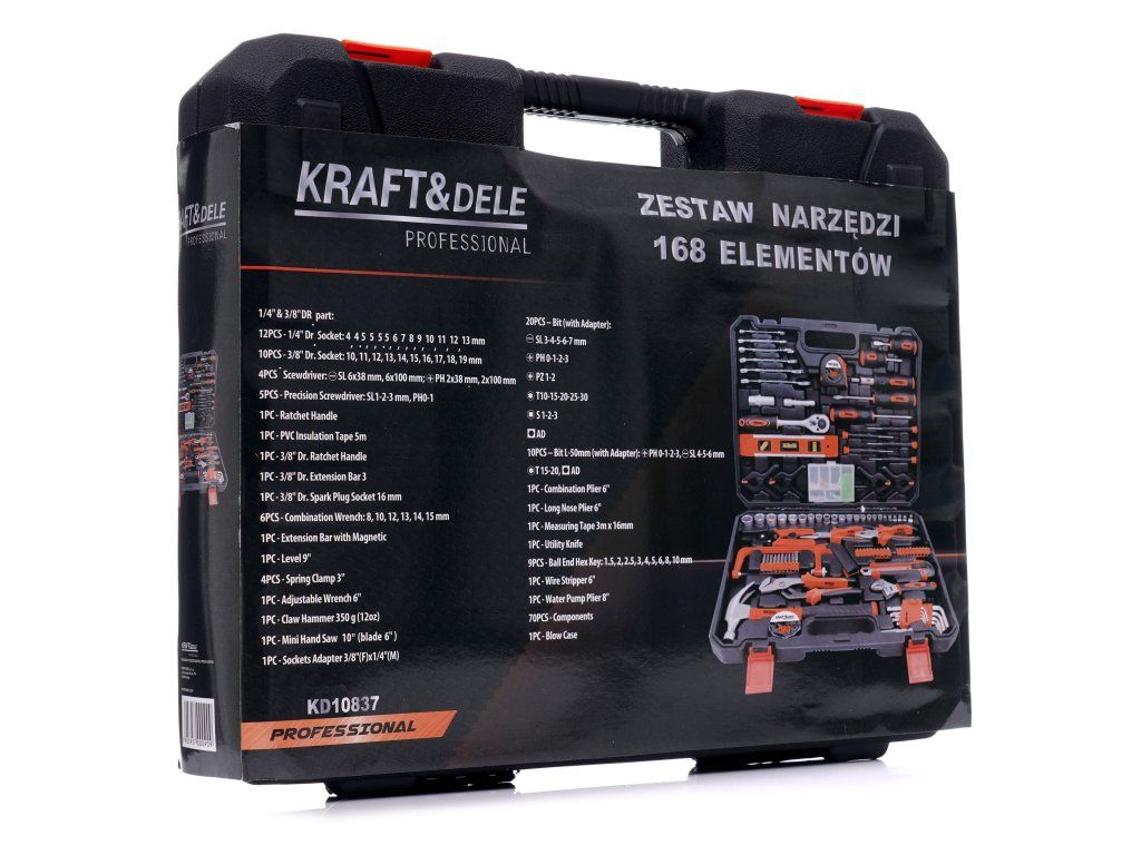 Extrémně rozsáhlá sada nářadí Kraft&Dele se symbolem KD10837. Nářadí se vyznačuje solidním zpracováním, odolnými materiály a šikovným kufrem, ve kterém má každé nářadí své místo. Celá sada se skládá ze 168 různých prvků, které zajistí správný výběr nářadí pro vaše potřeby. Nástroje jsou vyrobeny z kalené chrom-vanadiové oceli (CrV) určené pro dílenské nářadí. Chrom zaručuje odolnost oceli vůči korozi, oxidaci, otěru a vysokou odolnost vůči vysokým teplotám. Přídavek vanadu inhibuje růst zrn během zpracování a zároveň zvyšuje tažnost kalené i temperované formy. Kufr vyrobený z odolného plastu vám umožní mít věci uspořádané a snadno přenášet své nářadí. Každý nástroj má své určené místo, kde snadno najdete požadovanou velikost klíče.