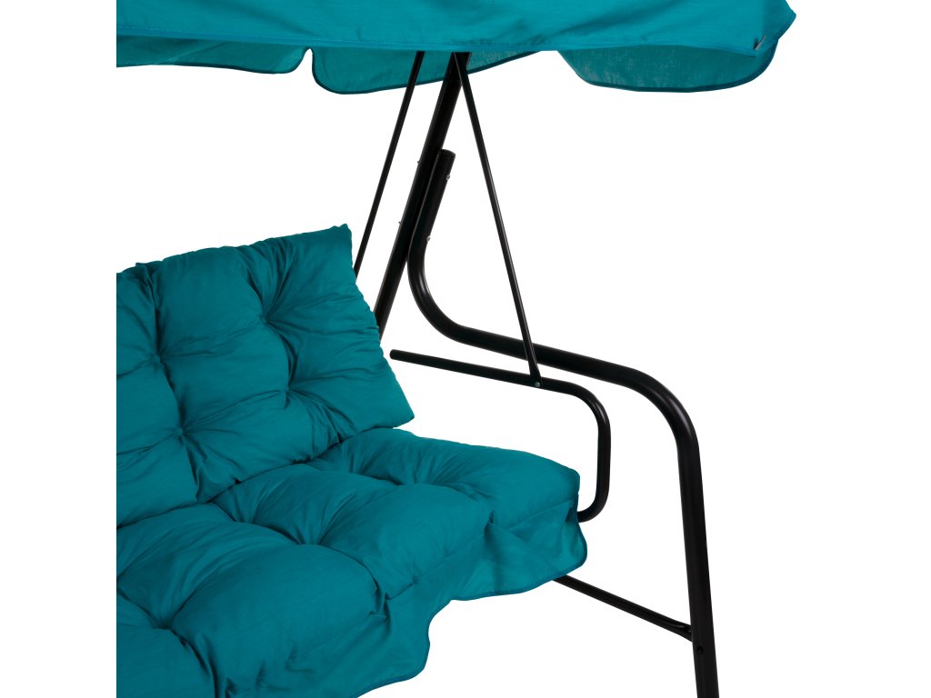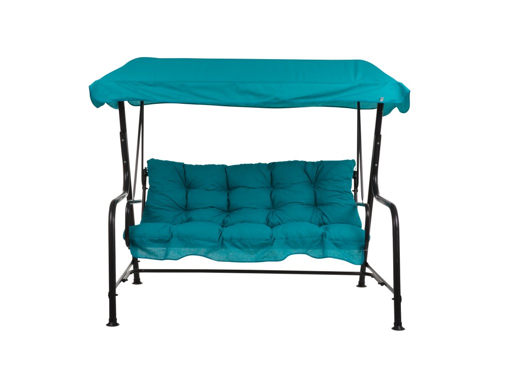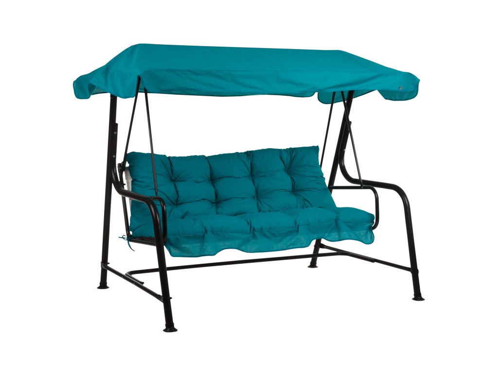 Sedáky a stříška na zahradní houpačku. Komfortní sada podušek se skládá ze sedáku na sedadlo, sedáku na opěradlo a stříšky, vše v modré barvě. Vrch sedáků je vyrobený z bavlněno-polyesterové tkaniny (48% bavlna, 52% polyester), spodek z polypropylenu. Obšito barevným polyesterovým lemem sladěným s tkaninou. Sedáky mají šňůrky pro připevnění k rámu a dekorativní prošití. Stříška je vyrobena ze stejné, bavlněno-polyesterové tkaniny. Sedáky a stříška budou jistě ozdobou vaší houpačky.