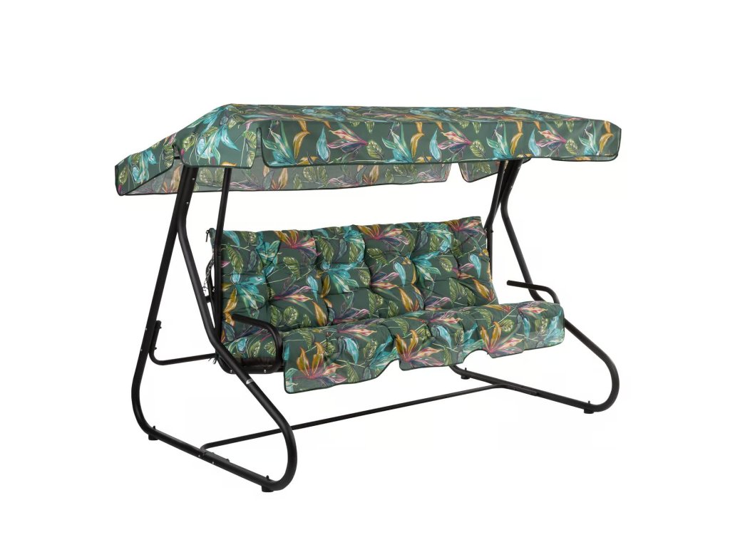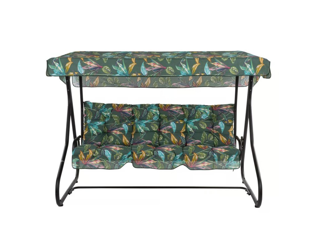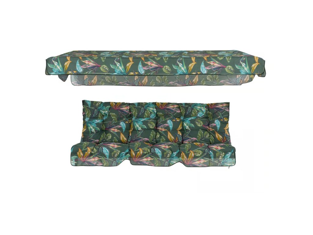 Udělejte svou houpačku ještě pohodlnější. Sada podušek s motivem tropických listů na zeleném pozadí se skládá ze sedáku na sedadlo, sedáku na opěradlo a stříšky. Vrch sedáků je vyrobený z bavlněno-polyesterové tkaniny (48% bavlna, 52% polyester), spodek z polypropylenu. Obšito barevným polyesterovým lemem sladěným s tkaninou. Sedáky mají šňůrky pro připevnění k rámu a dekorativní prošití. Stříška je ze stejné tkaniny a ve stejném vzoru jako sedáky. Tato sada sedáků se stříškou sedí na houpačky z naší nabídky Parma a Milano od výrobce Patio.
