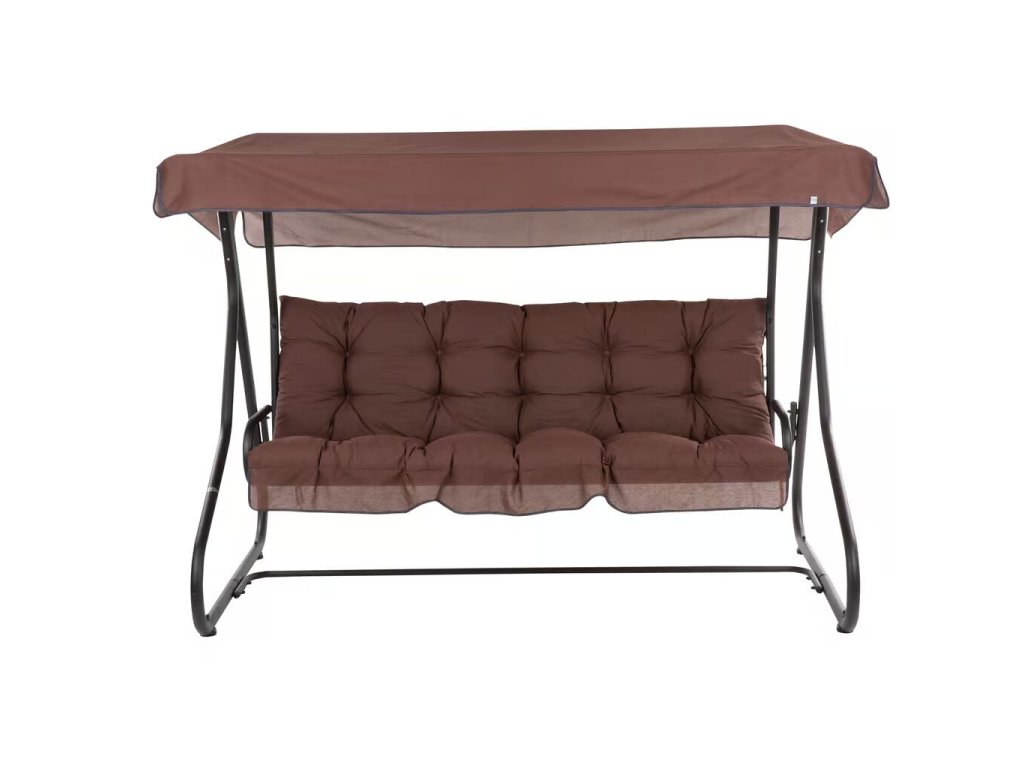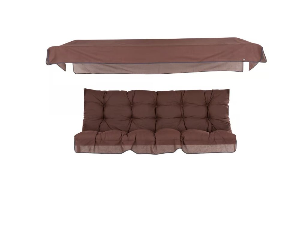 Sada podušek v jednolité hnědé barvě se skládá ze sedáku na sedadlo, sedáku na opěradlo a stříšky. Vrch sedáků je vyrobený z bavlněno-polyesterové tkaniny (48% bavlna, 52% polyester), spodek z polypropylenu. Obšito barevným polyesterovým lemem sladěným s tkaninou. Sedáky mají šňůrky pro připevnění k rámu a dekorativní prošití. Stříška je ze stejné tkaniny a ve stejném vzoru jako sedáky. Tato sada sedáků se stříškou sedí na houpačky z naší nabídky Parma a Milano od výrobce Patio.