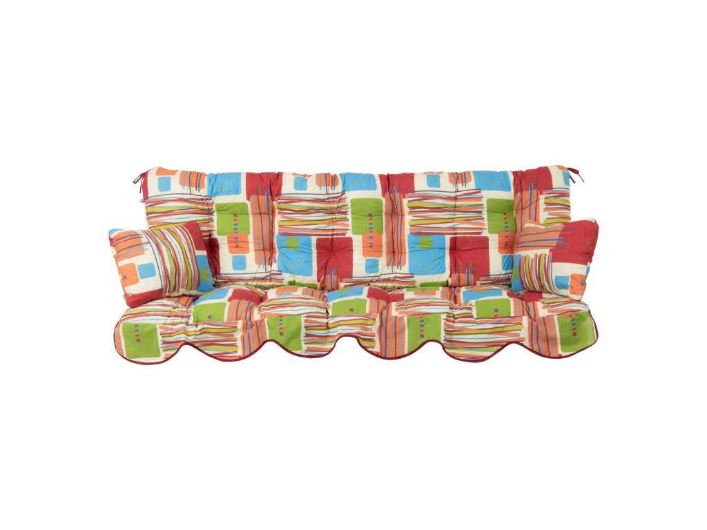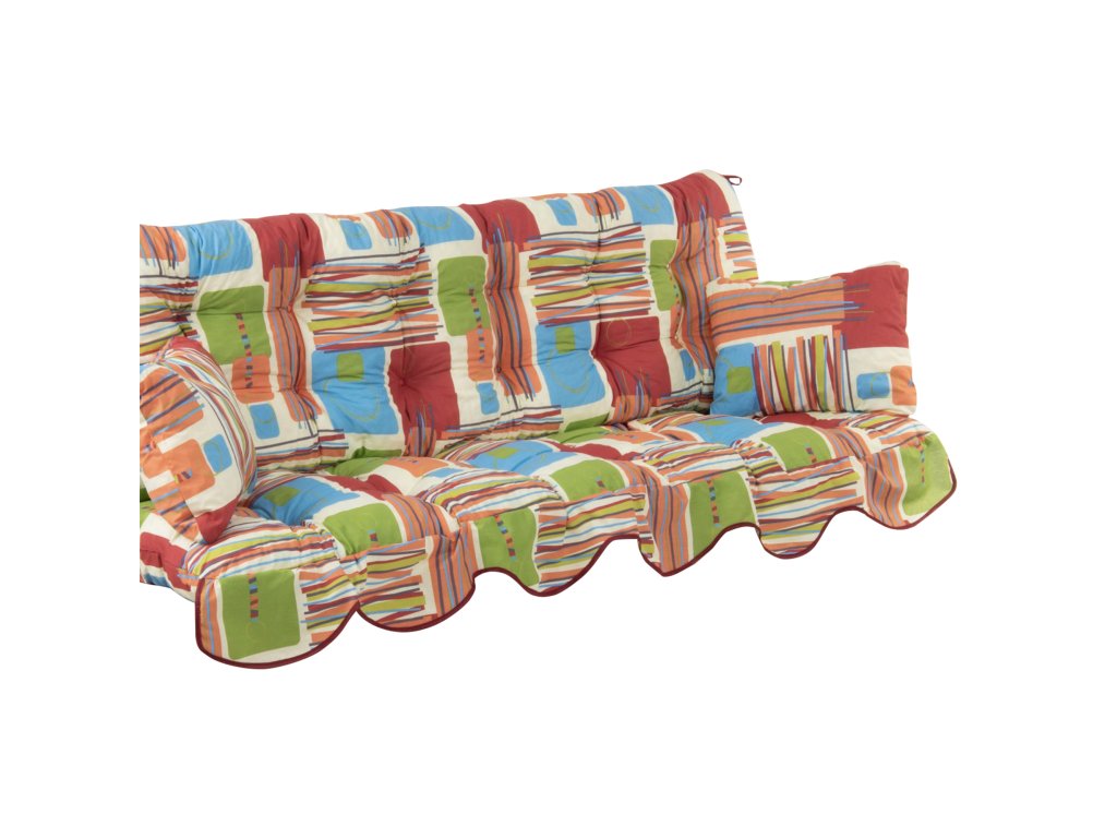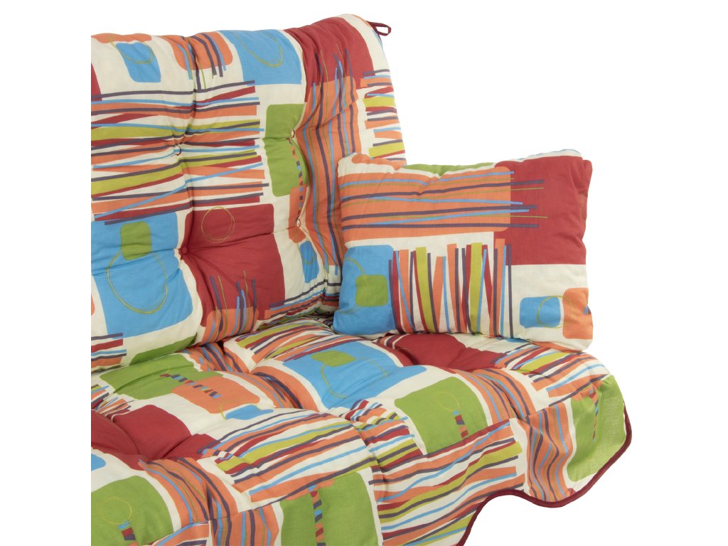 Sada sedáků s barevným geometrickým vzorem vám zajistí pohodlný odpočinek na houpačce. Vrch a spodek je vyrobený z měkké a odolné bavlněné tkaniny. Elegantní prošívání dodává stylový vzhled. Výplň z řezané houbičky zajišťuje komfort a pohodlí bez ohledu na polohu. Sedáky jsou lemovány odolným polyesterovým lemem. V ohbí mají šňůrky na upevnění, díky kterým zůstanou vždy na svém místě. Područky, které jsou součástí sady zvyšují pohodlí při sezení.