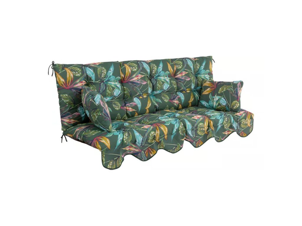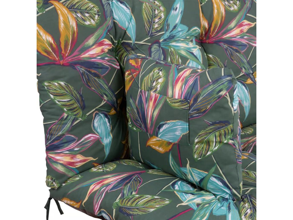 Vneste do své zahrady svěžest a pohodlí se sadou podušek na houpačku v moderním exotickém stylu. Poutavý motiv velkých listů v odstínech zelené, tyrkysové, fialové a oranžové barvy dodává poduškám osobitý a módní charakter. Podušky jsou vyrobené s důrazem na detail, kombinují vysoce kvalitní materiály s funkčností, zajišťují odolnost a pohodlí při používání. Horní část je vyrobena z bavlněno-polyesterové tkaniny (48% bavlna, 52% polyester), spodní část je z polypropylenu. Pružná výplň z řezané houbičky flocke se dokonale přizpůsobí vašemu tělu a prošívání na opěradle a sedadle je nejen estetickým prvkem, ale také zabraňuje pohybu výplně. Oba sedáky jsou vybavený šnůrkama pro připevnění k rámu. Součástí sady jsou také 2 područky, které ještě více zpříjemní odpočinek na houpačce.