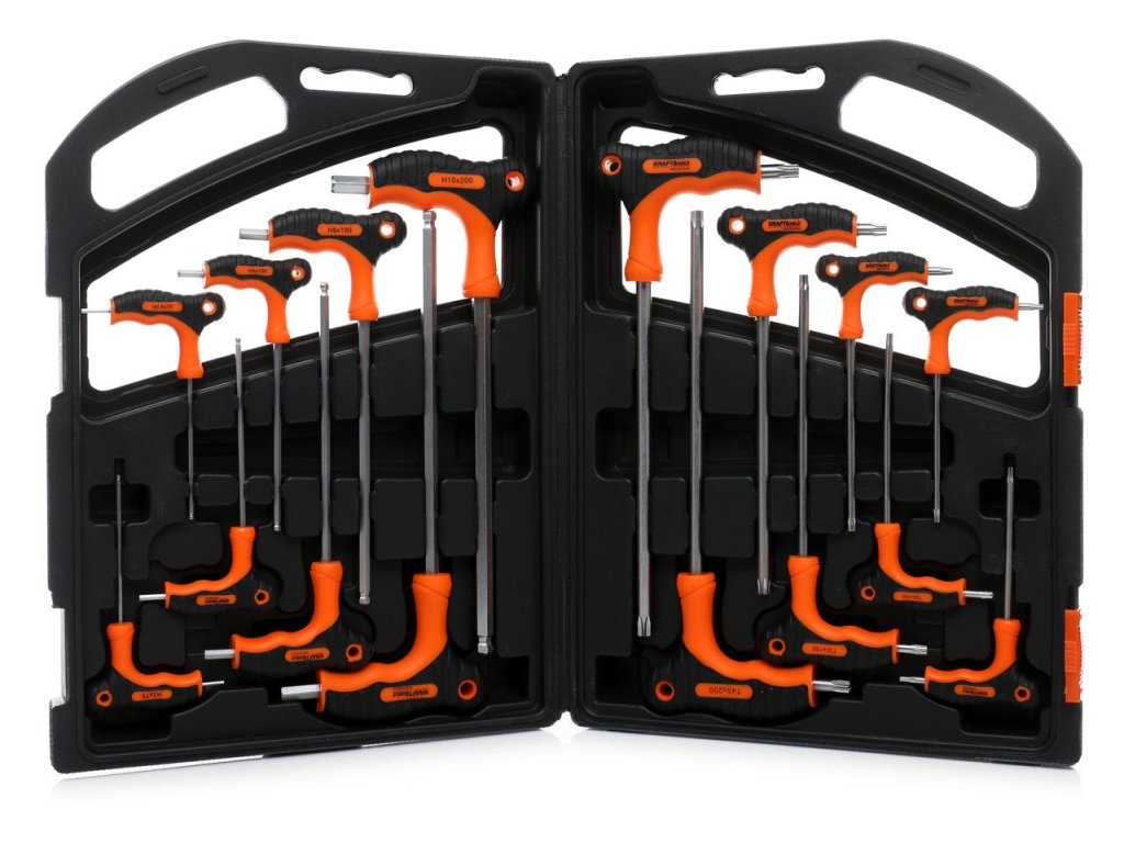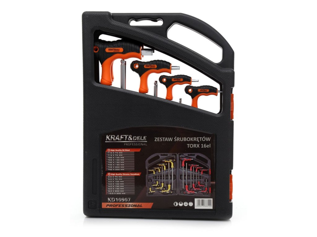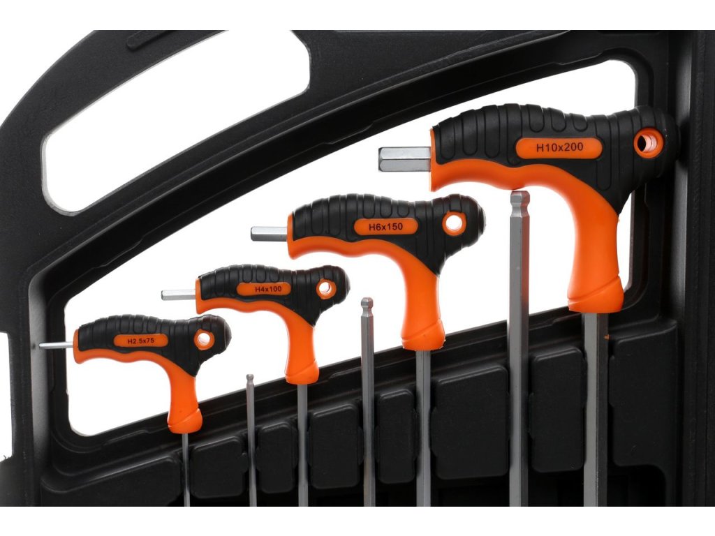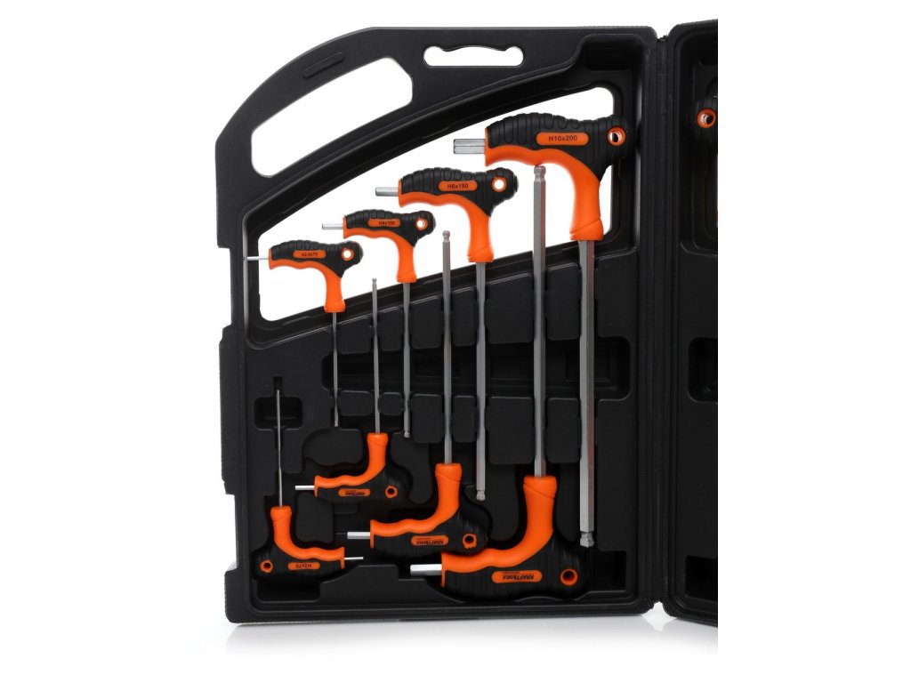 - 8 šroubováků typu "T" imbus (2.0x75, 2.5x75, 3.0x100, 4.0x100, 5.0x150, 6.0x150, 8.0x200, 10.0x200mm)