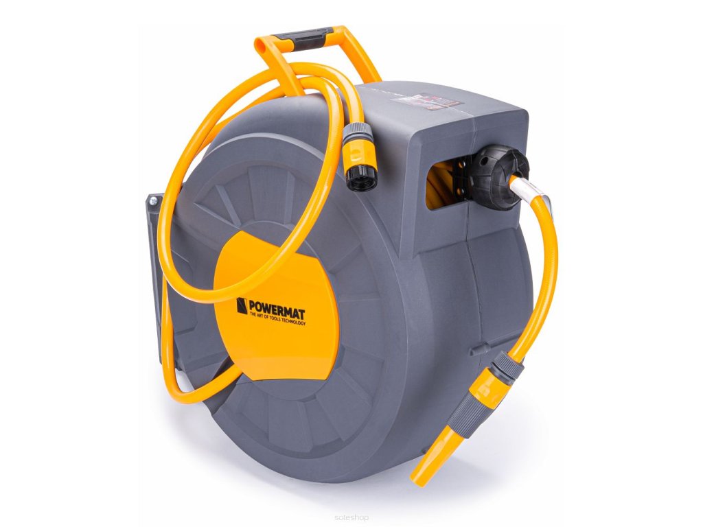Automatický naviják zahradní hadice POWERMAT je určen pro pohodlné skladování a používání zahradní hadice. Díky automatickému procesu navíjení hadice nebyly zalévání, kropení a všemožná práce se zahradní hadicí nikdy tak příjemná. Naviják zajistí pohodlí při práci a zabrání zamotání a zauzlování hadice. Automatický naviják zahradní hadice je perfektním řešením pro lidi, kteří oceňují pohodlí. Nyní bude zalévání vašich rostlin velmi jednoduché a velmi příjemné, bez rizika zakopnutí. Díky otočné rukojeti je možné buben upevnit na stěnu a otáčet. Nabízený automatický buben má 2-3 aretační pozice na metr, což značně usnadňuje nastavení požadovaného rozsahu použití. Zajišťuje také snadné a bezpečné uložení hadice v odolném kompaktním pouzdře. Nabízený naviják má pevné vodicí kladky a funkci bezpečného návratu, díky které si můžeme být jisti, že se hadice na konci práce navine do bezpečné úrovně.