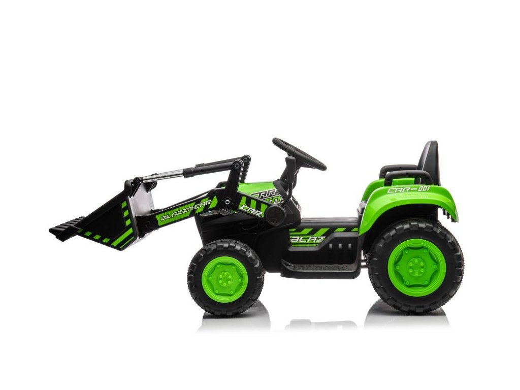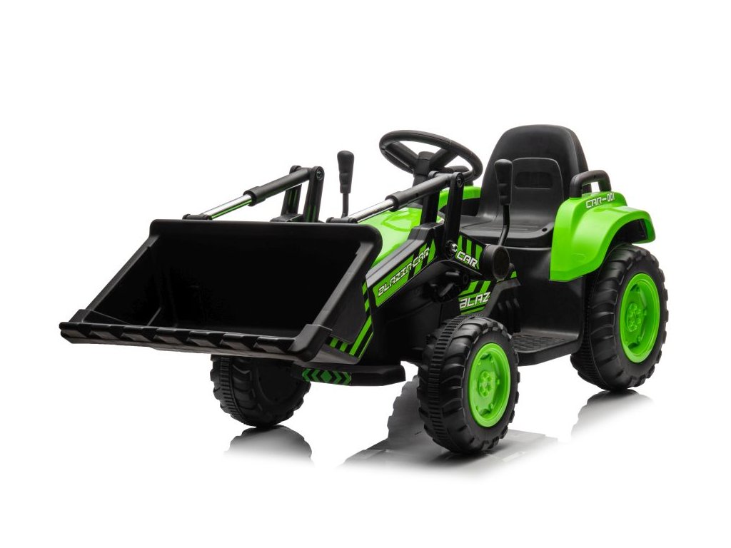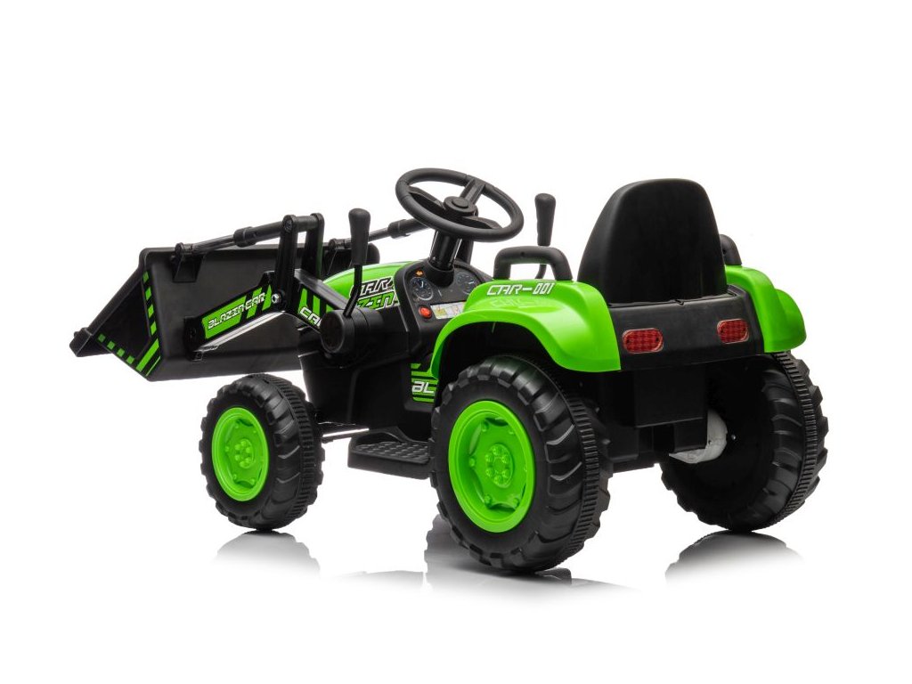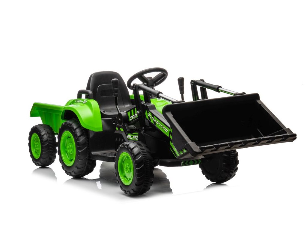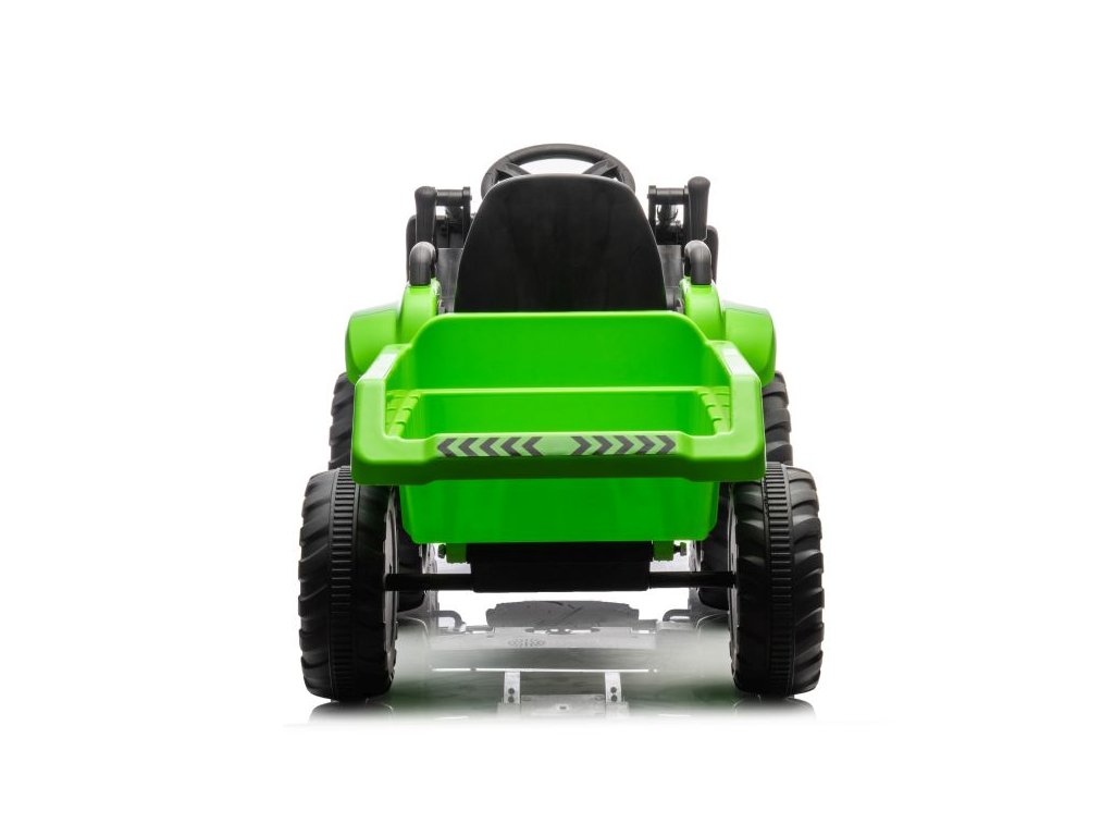 Dětský elektrický traktor s přívěsem a nakládací lžící zelený