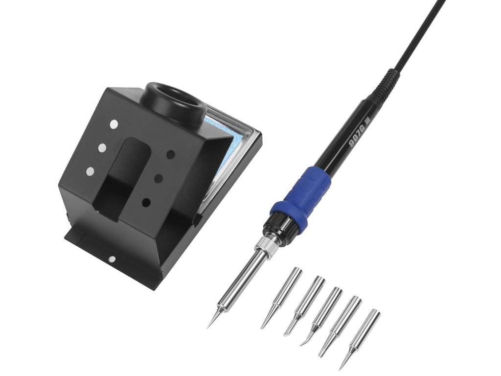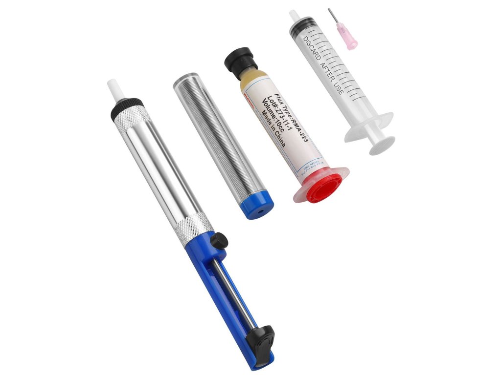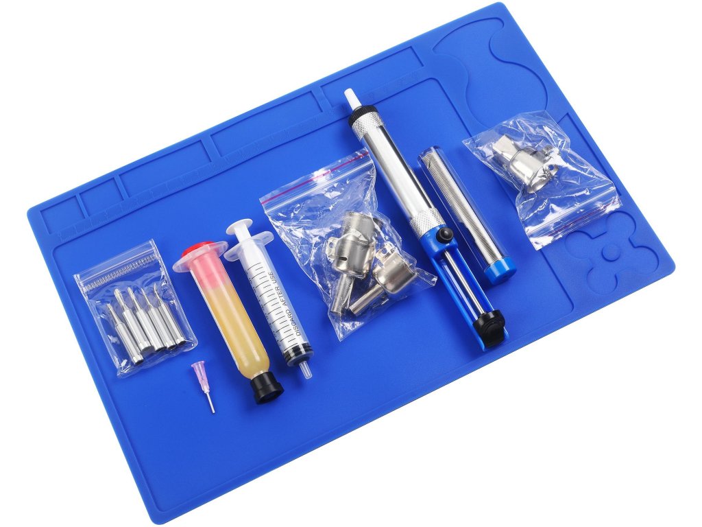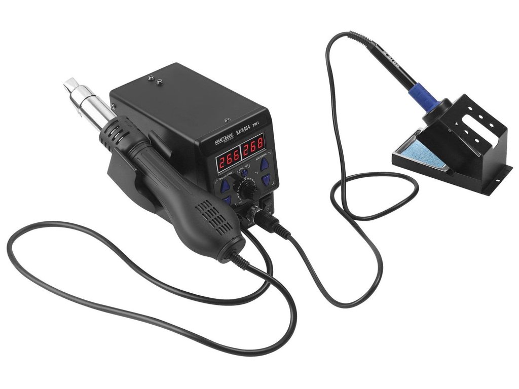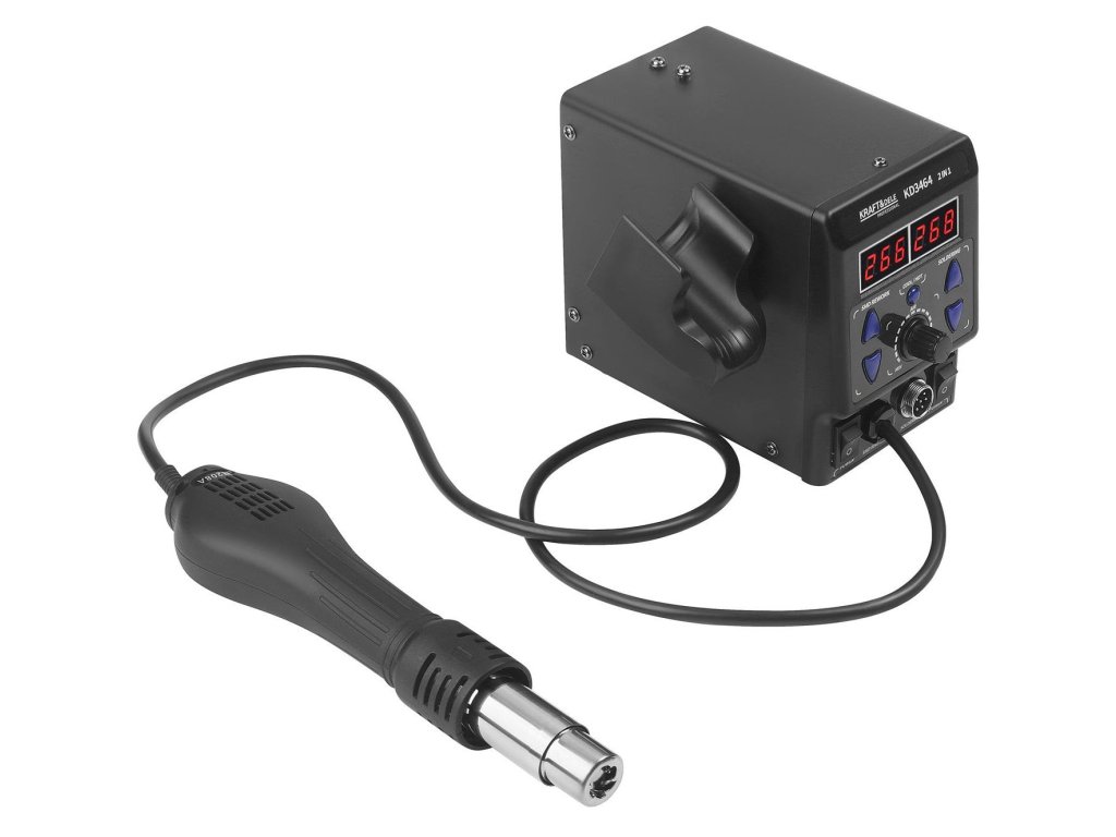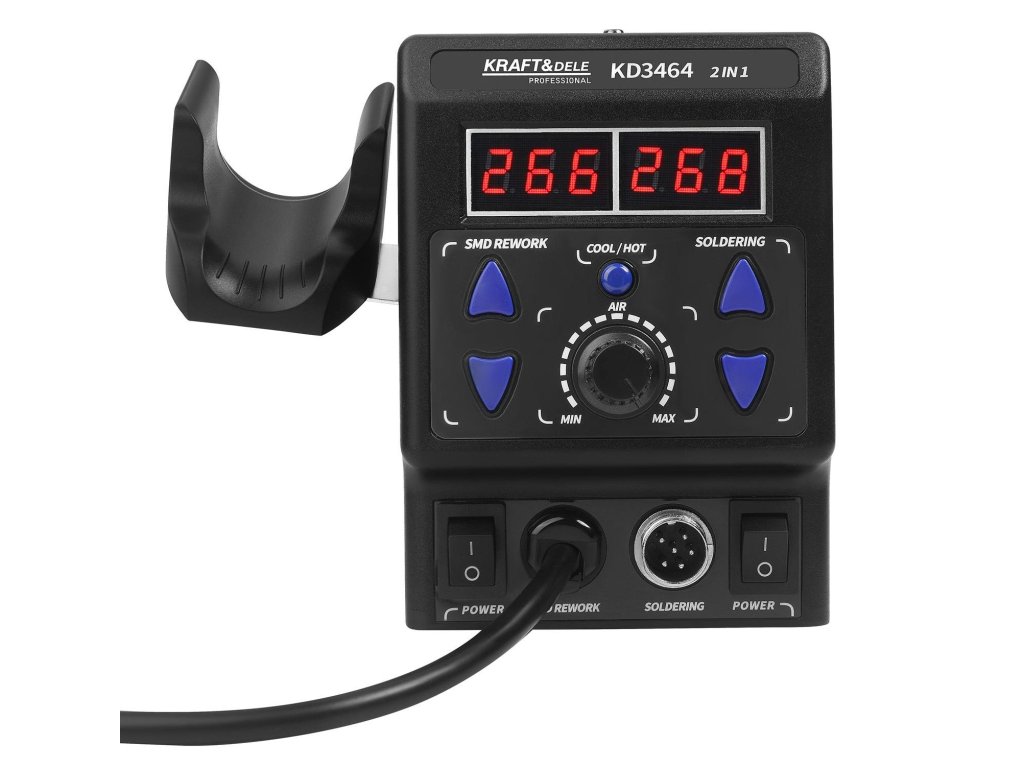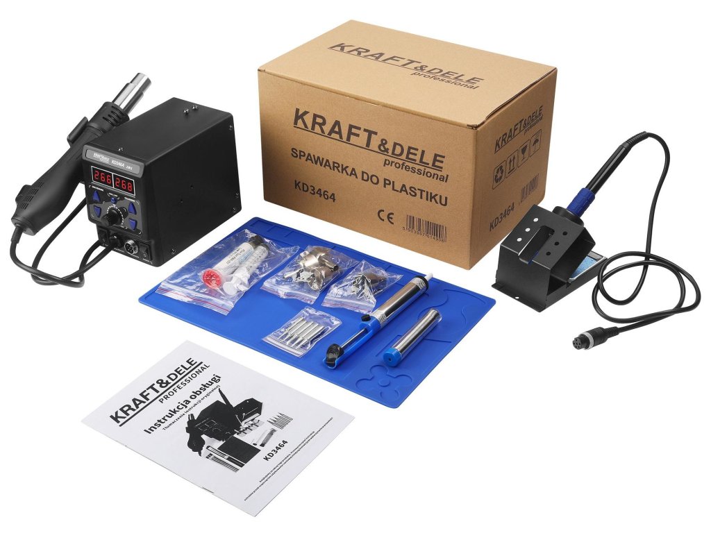 Model KD3464 se dodává s bohatou sadou příslušenství, která z něj činí kompletní dílenské vybavení. V balení naleznete vše potřebné pro okamžité zahájení práce: různé pájecí hroty, trysky na horkovzdušnou pistoli, topidlo (flux), injekční stříkačku, odsávačku cínu a pájecí podložku. S touto stanicí od Kraft&Dele budete připraveni na jakoukoli výzvu v oblasti svařování plastů a elektroniky.