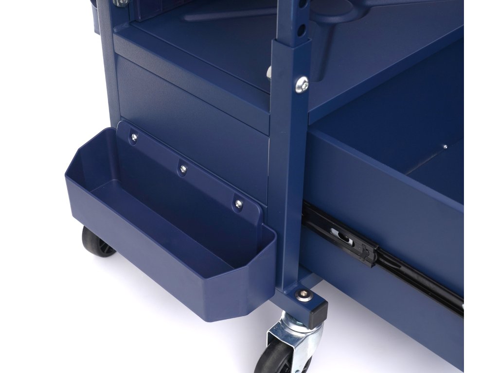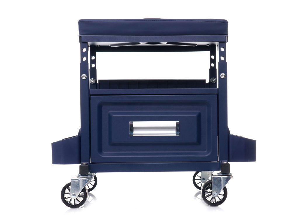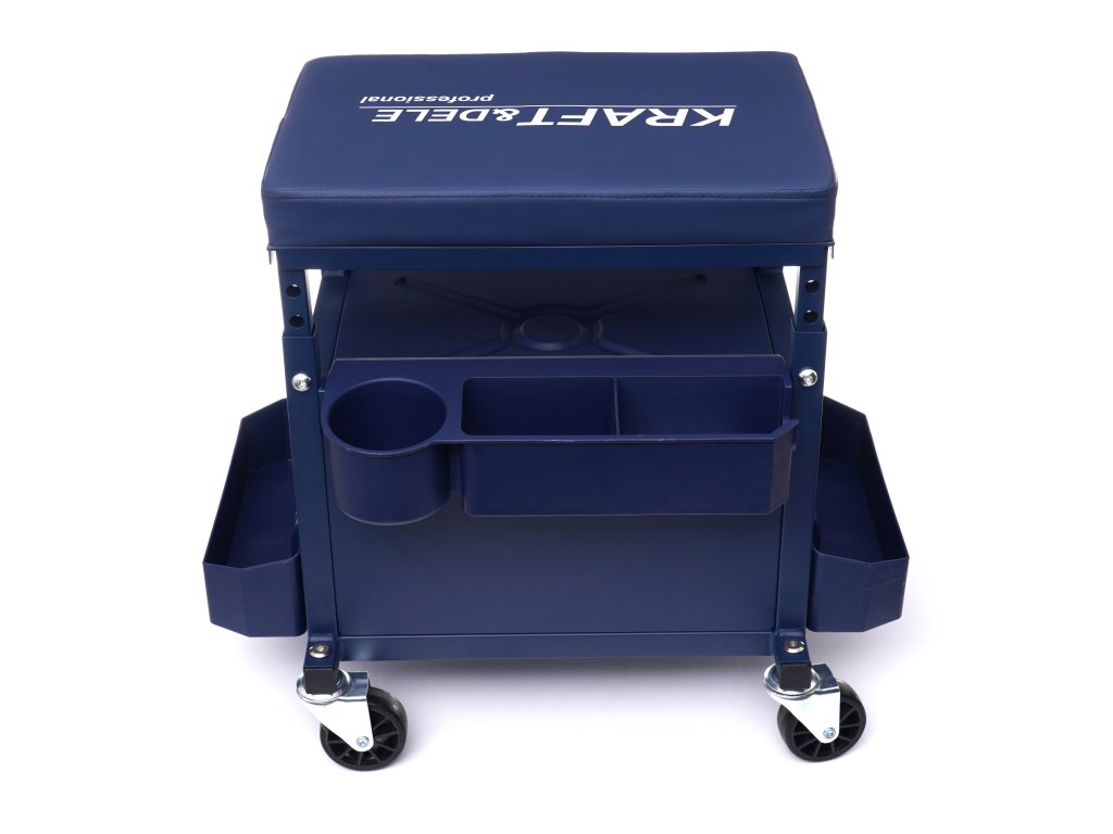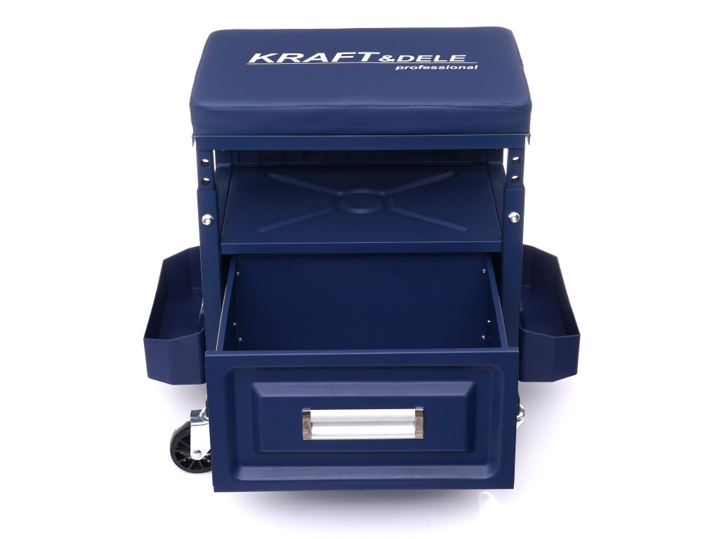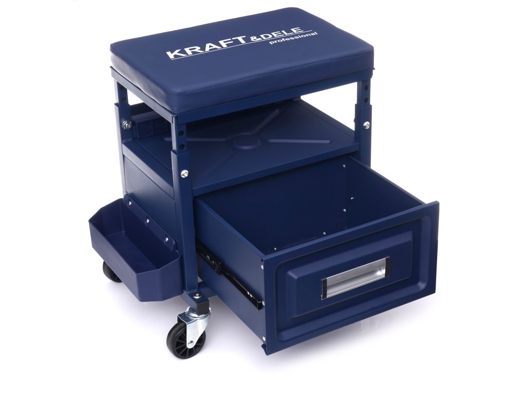 Taboret warsztatowy marki Kraft&Dele zaprojektowano do użytku w profesjonalnych warsztatach, serwisach samochodowych, zakładach naprawczych, a także w przydomowym garażu. Wyposażony został w pojemną szufladę o udźwigu ok. 9 kg. Dodatkowo posiada 3 półki, w których z łatwością umieścimy narzędzia wykorzystywane podczas pracy.