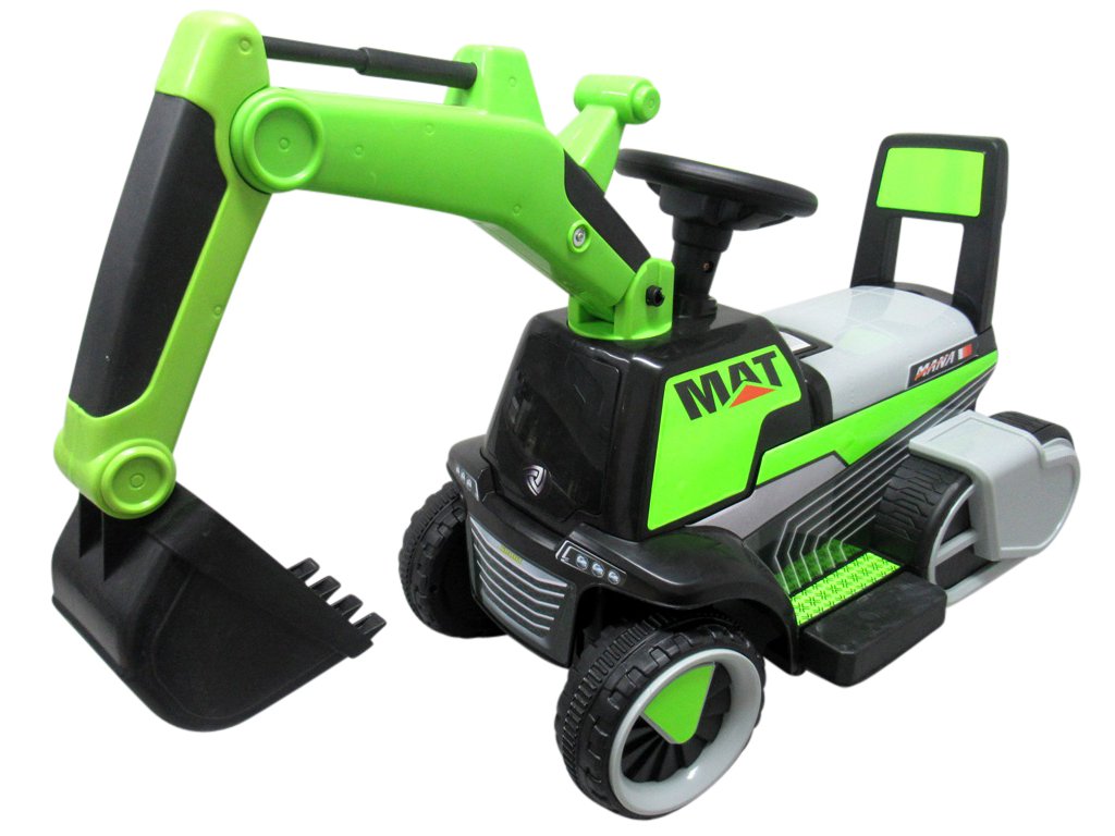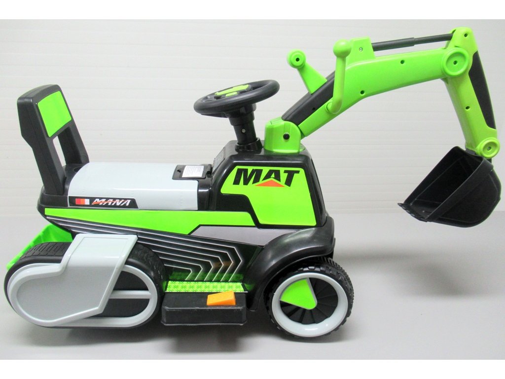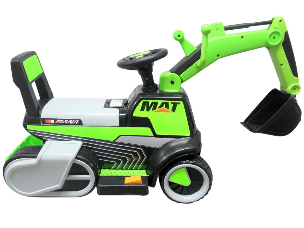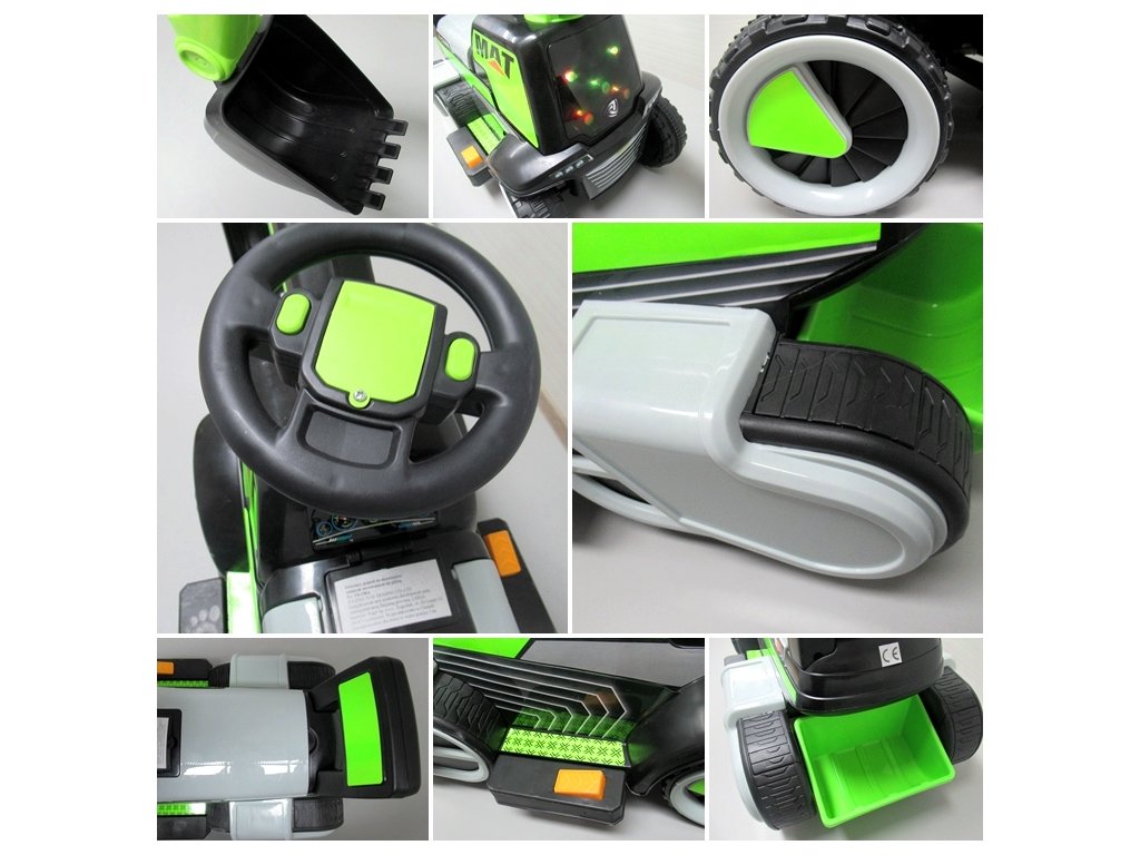 Dětský elektrický bagr ve třech barvách. Dítě řídí vozidlo samostatně, sedí za volantem. Vozidlo je obecně určeno pro venkovní použití, ale jeho ergonomický design umožňuje jeho použití i ve větších místnostech, jako je terasa nebo obývací pokoj. Doporučený věk uživatele 1,5-5 let. Hudba řzená dětmi. Přední svítící LED světla. Vozidlo není vybaveno dálkovým ovládáním.