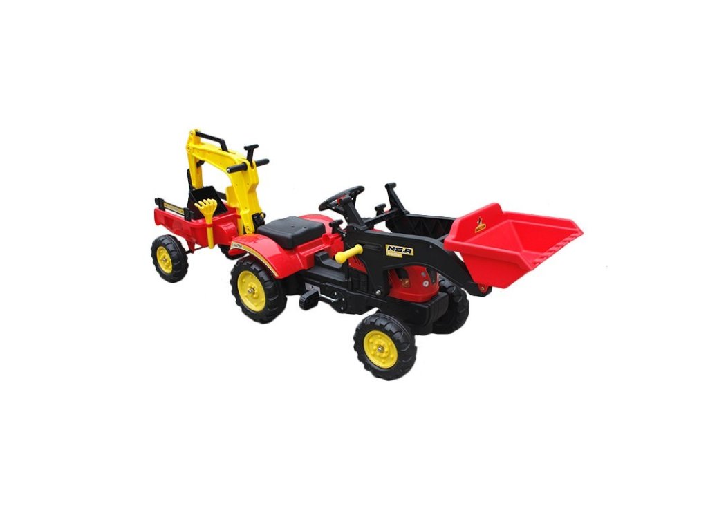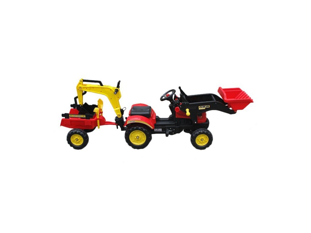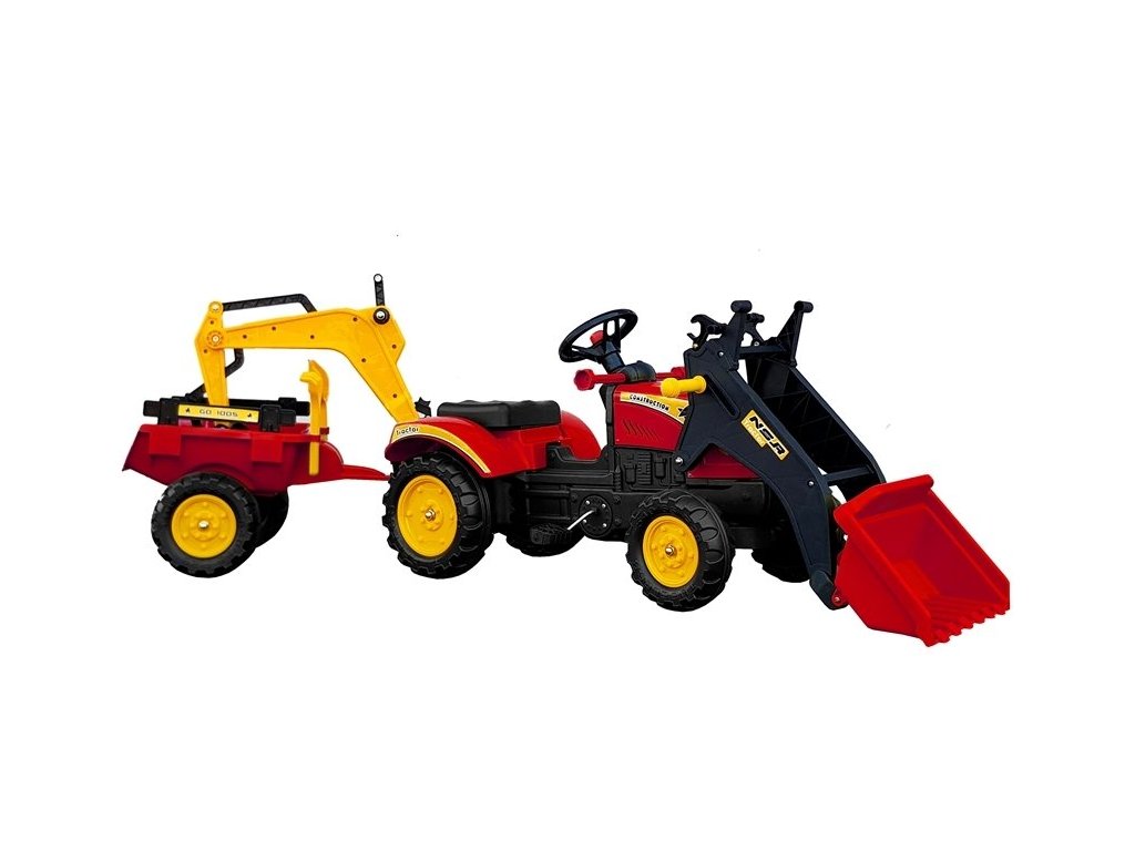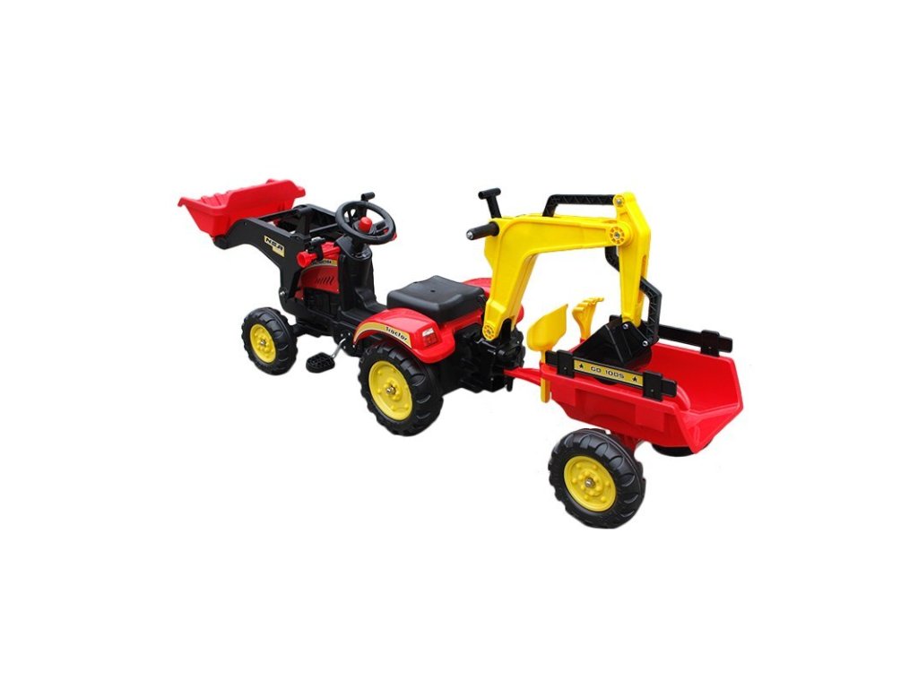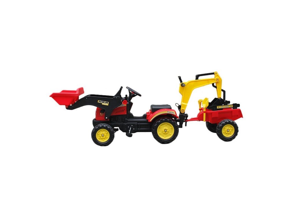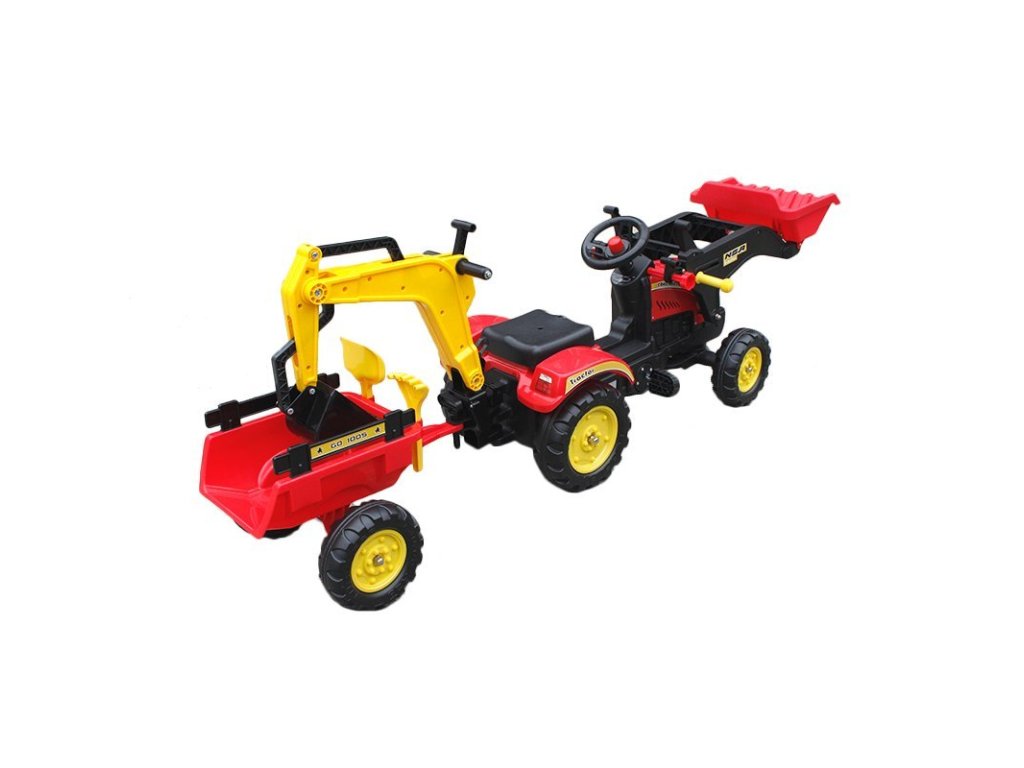 Gokart Traktor/bagr s přívěsem a příslušenstvím na pedály. Součástí je i příslušenství - lopata a hrábě. Kola traktoru jsou plastová.