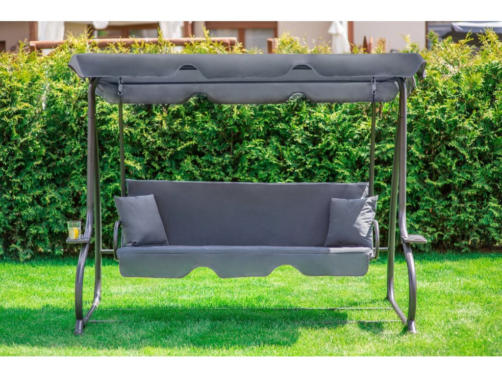 Novinka roku 2023 tří místná zahradní houpačka TOMIDO COMFORT LUX se vyznačuje mimořádným komfortem a kvalitním zpracováním. Umožňuje příjemný odpočinek a může být skvělou dekorací jak na zahradě, tak na terase. Sedák je fixován pružinami, lze jej sklopit do ležící polohy (v ležící poloze slouží pouze jako lehátko), na koncích jsou praktické područky. Střecha s plynulým nastavením úhlu sklonu, má speciální tunely v materiálu, přizpůsobené konstrukci střechy a je výbornou ochranou před sluncem. Ocelový rám s práškovým nástřikem se vyznačuje odolnou konstrukcí a odolností vůči povětrnostním vlivům. Na obou stranách houpačky naleznete velmi užitečné boční stolky na nápoje. Součástí balení jsou dva polštáře, které vám zpříjemní odpočinek.