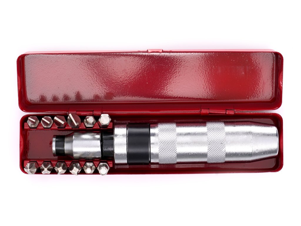 Rázový šroubovák pro poklepávání spolu se sadou bitů KD1448 dobře poslouží v každé garáži nebo dílně. Použití vysoce kvalitních materiálů při výrobě bitů prodlužuje jejich životnost. Sada se skládá ze 13 prvků. Celá sada je zabalena v pevném a praktickém pouzdře. Multifunkční nástroj je nezbytný v každé dílně a při drobných domácích opravách. Sada obsahuje univerzální rukojeť s vyměnitelnými hroty a nastavením otáčení vpravo/vlevo.