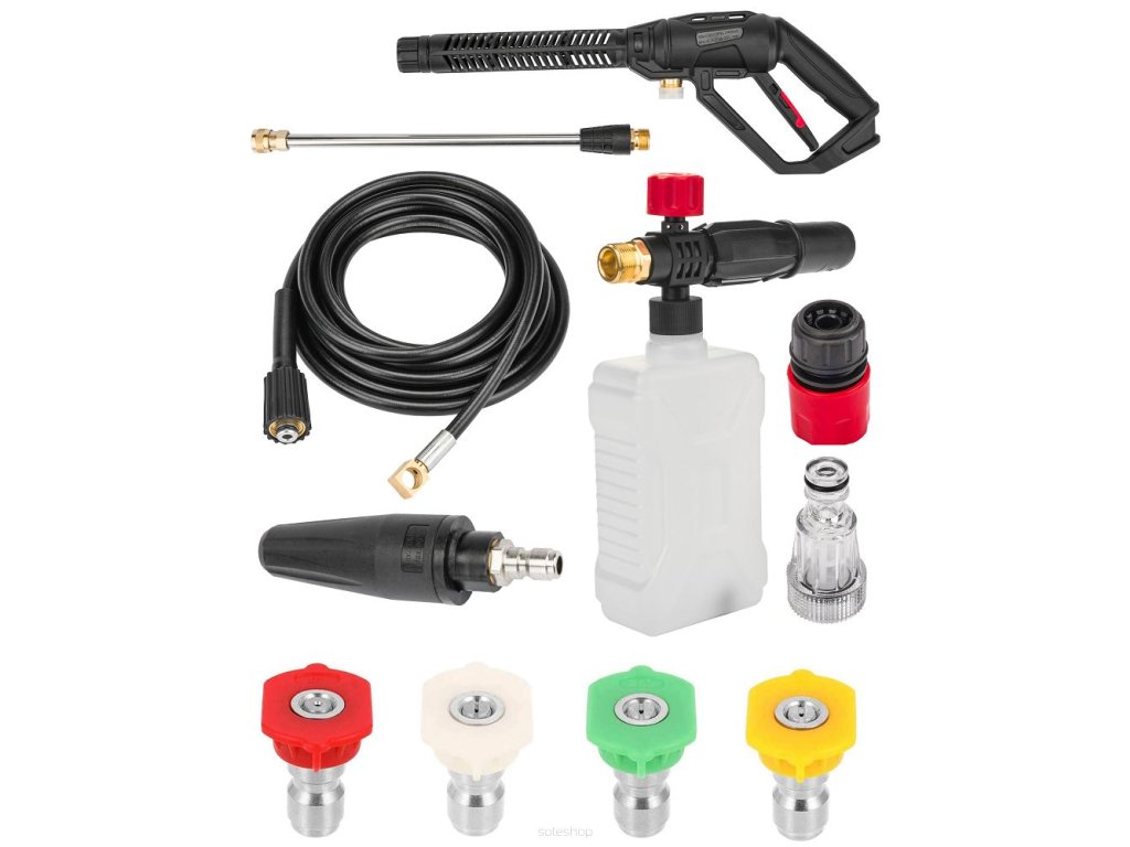 Myčka má navíc pěnovou trysku s možností nastavení úhlu rozstřiku, díky které při otočení knoflíku kapalina neuniká z nádržky a takové použití umožňuje např. mytí.