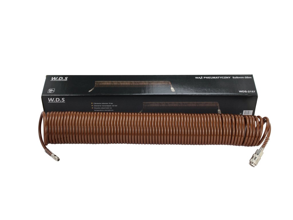 Wąż pneumatyczny polskiej marki W.D.S model WDS2157 o długości 20m. Świetnie nada się do szlifierek, kluczy udarowych, pistoletów lakierniczych. Swoje zastosowanie znajdzie również w serwisach samochodowych czy lakierniach proszkowych.