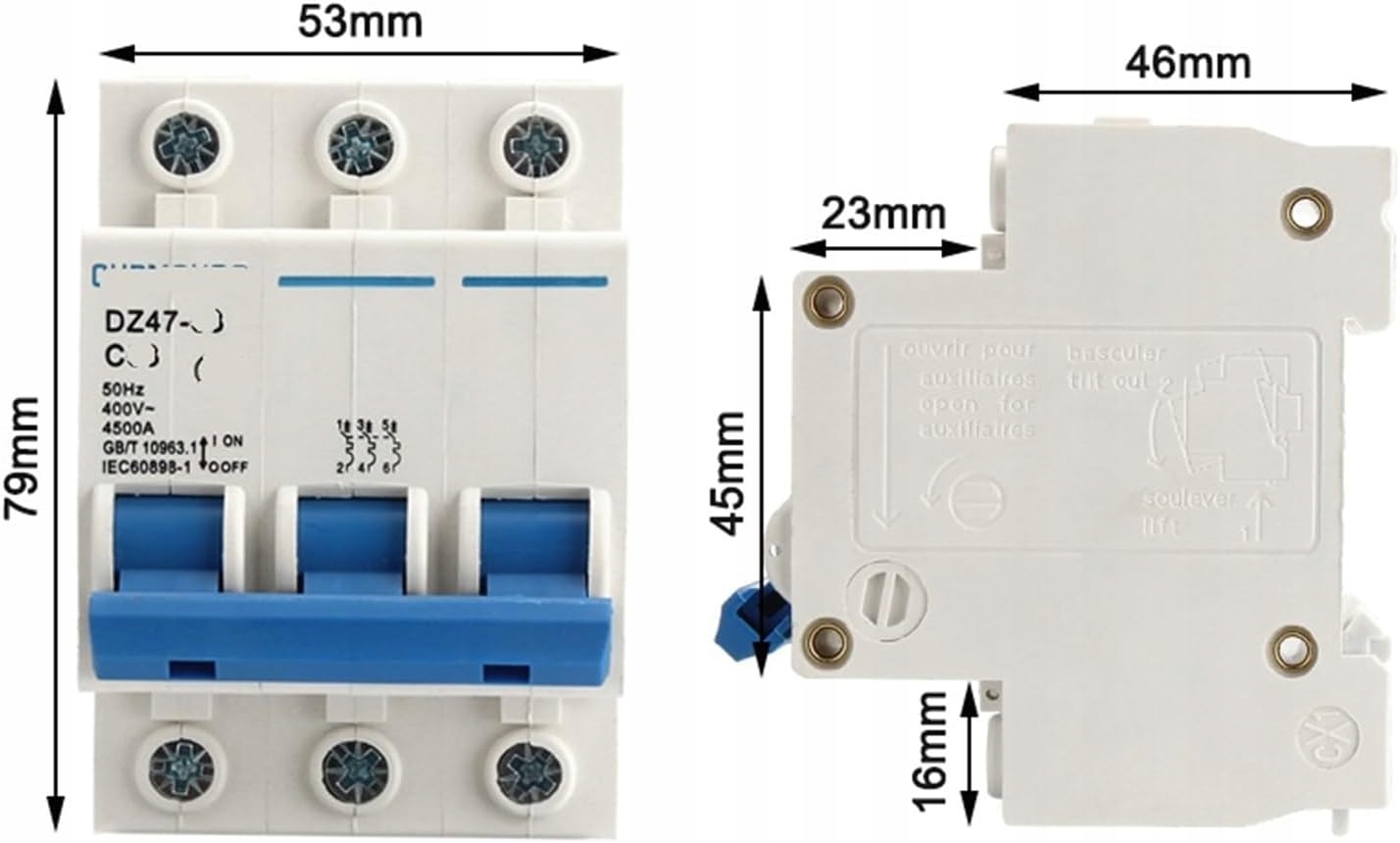 Zdolność wyłączania 4500A: Zdolność wyłączania tego miniaturowego wyłącznika wynosi 4500A, co ma zastosowanie do ogólnych budynków biurowych i budynków mieszkalnych.
