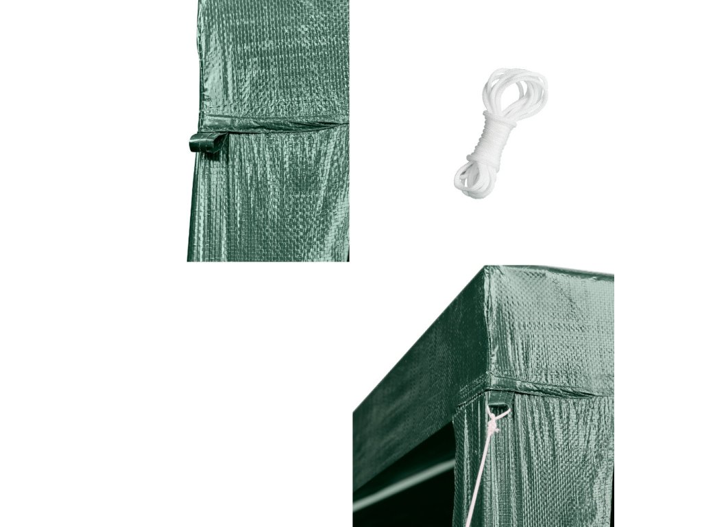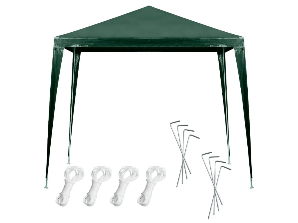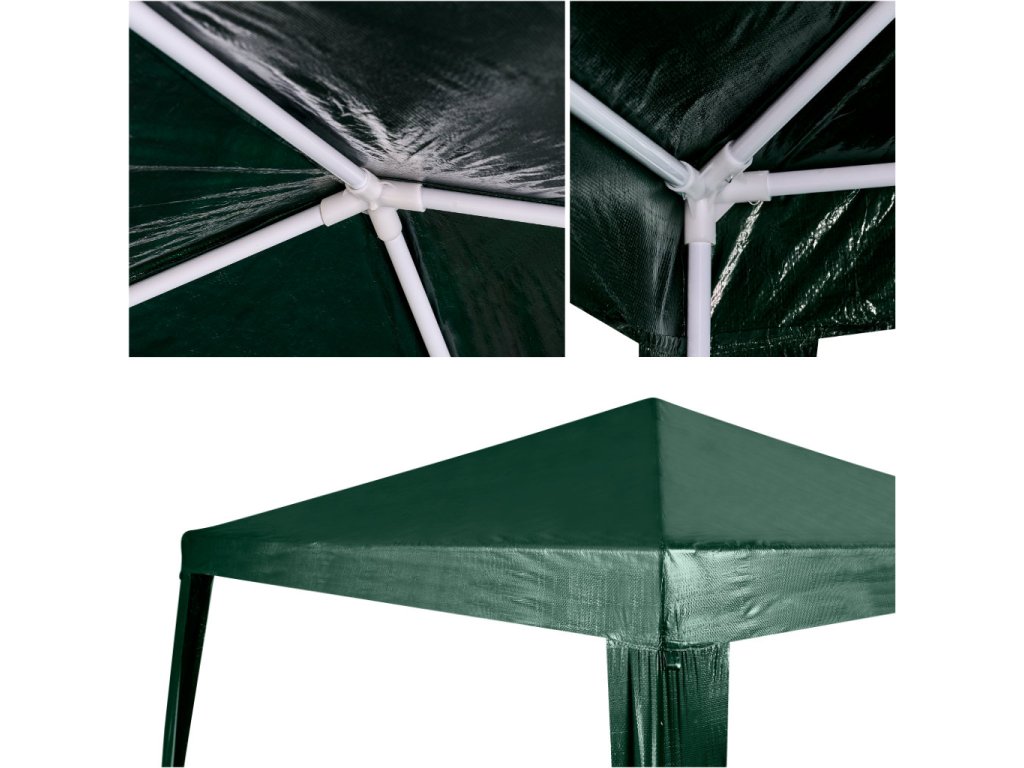 Zelený zahradní altán o rozměrech 2,5 x 2,5 m je praktickým řešením, které vám umožní efektivně využít prostor na vaší zahradě či pozemku. Chrání před sluncem a lehkým deštěm a vytváří tak útulné místo k odpočinku venku. Konstrukce je založena na stabilním kovovém rámu se čtyřmi nohami. Celková výška pavilonu je 2,55 m, což poskytuje komfortní užitný prostor. Potah vyrobený z odolného PE materiálu o gramáži 90 g/m² zaručuje odolnost vůči povětrnostním vlivům. Sada obsahuje montážní prvky: kryt, rám, spojky a kotevní kolíky.