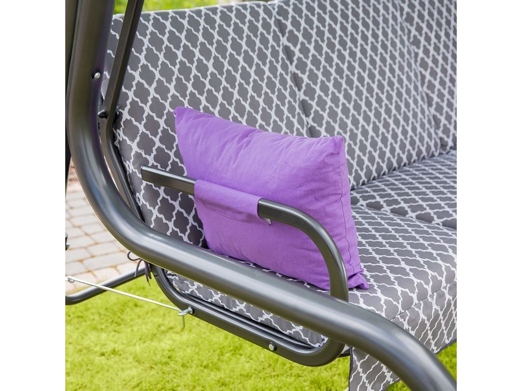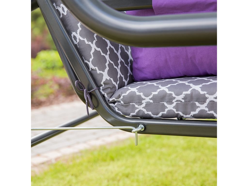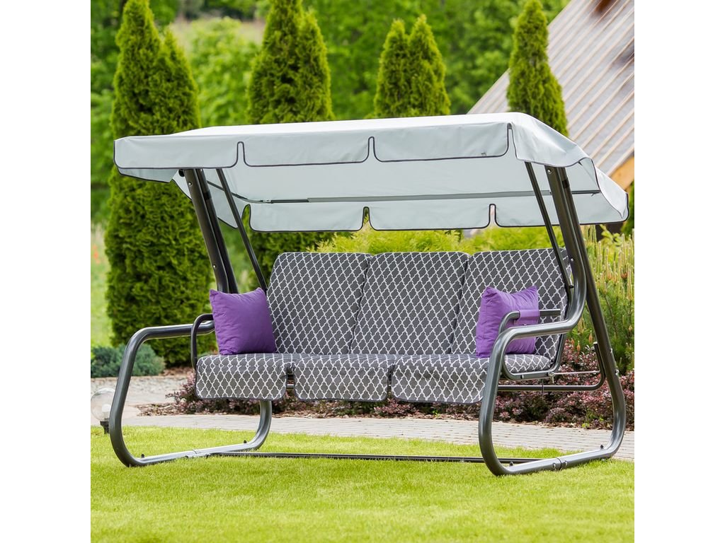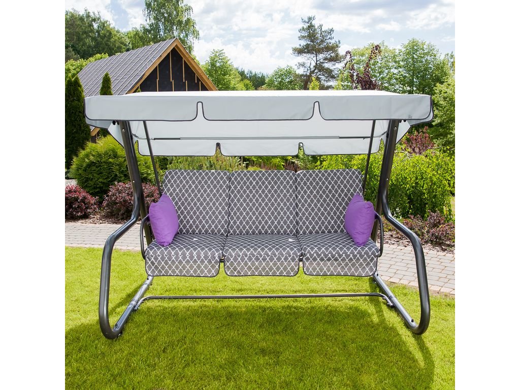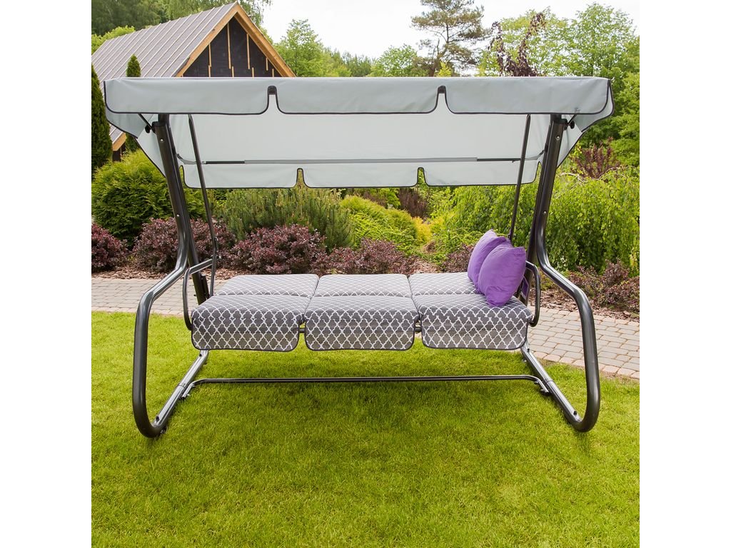 Model Rimini je nejlepší houpačka, vhodná až pro čtyři dosplělé osoby. Široké a pohodlné sedadlo lze snadno změnit na ideální místo, kde si můžete lehnout. Odolná konstrukce rámu z tlustých a odolných ocelových trubek s práškovým nástřikem zajišťuje bezpečnost odpočinku. Životnost a funkčnost houpačce při každodenním používáním dodává vysoce kvalitní zpracování a pozornost každému detailu zahradní houpačky. . Výhodou houpačky je jednoduché, pohodlné rozložení a stabilita sklopného sedadla. Houpačka je vybavena zámkem, který zabraňuje houpání v poloze ležení. Použité pružiny poskytují nejvyšší pohodlí při používání, jsou velmi trvanlivé a dodávají houpačce další stabilitu. Zahradní houpačky se sedadlem na pružinách usnadňují výměnu polštářů, které jsou součástí balení. Houpačka Rimini se vyznačuje funkční, polyesterovou stříškou. Je možné snadno nastavit úhel stříšky.