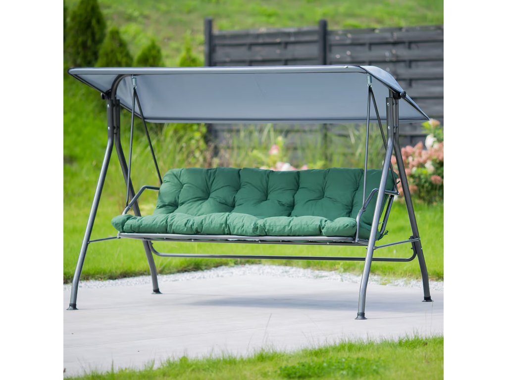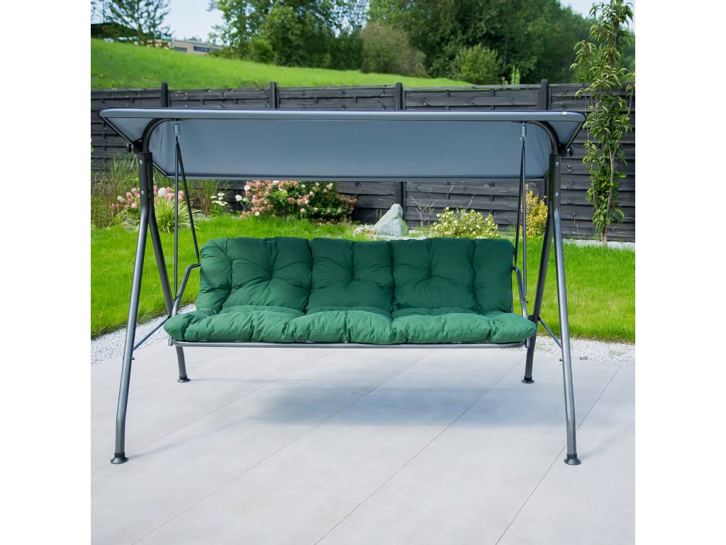 Houpačka Sevilla pro 3-4 osoby, se sedačkou upevněnou na pružinách. Solidní, pevná konstrukce. Rám malovaný práškovou polyestrovo - epoxidovou barvou. Sedadlo NELZE sklopit do ležící polohy. Barva rámu: antracit. V sadě také 2 sedáky (jeden na sedadlo a jeden na opěradlo). Sedáky jsou prošívané. Vrch i spodek sedáku je z bavlněno - polyesterové tkaniny. V opěrné části šňůrky pro připevnění k rámu. Výplň: řezaná houbička flocke. Stříška je vyrobena z tkaniny WATER REPELLENT, materiál je impregnován ve směru voděodolnosti, kapalina kondenzuje na povrchu díky speciálnímu hydrofobnímu povlaku. Tkanina je také odolná vůči skvrnám - nečistoty lze snadno odstranit otřením (bez vtírání) vlhkým hadříkem z mikrovlákna ,s použitím malého množství tekutiny. Pozor: neznamená to 100 procentní odolnost vůči silnému dešti !!