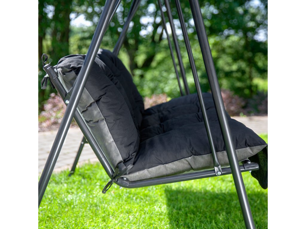 Dvě hrubé podušky jsou vyplněné řezanou houbičkou Flocke a zaručují pohodlný odpočinek. Horní část podušek je vyrobena z odolné, bavlněné tkaniny (100% bavlna), spodní část je z polypropylenu. Stříška je vyrobena ze stejné tkaniny jako podušky. Sedadlo houpačky (podložka) je z pevného PE materiálu.