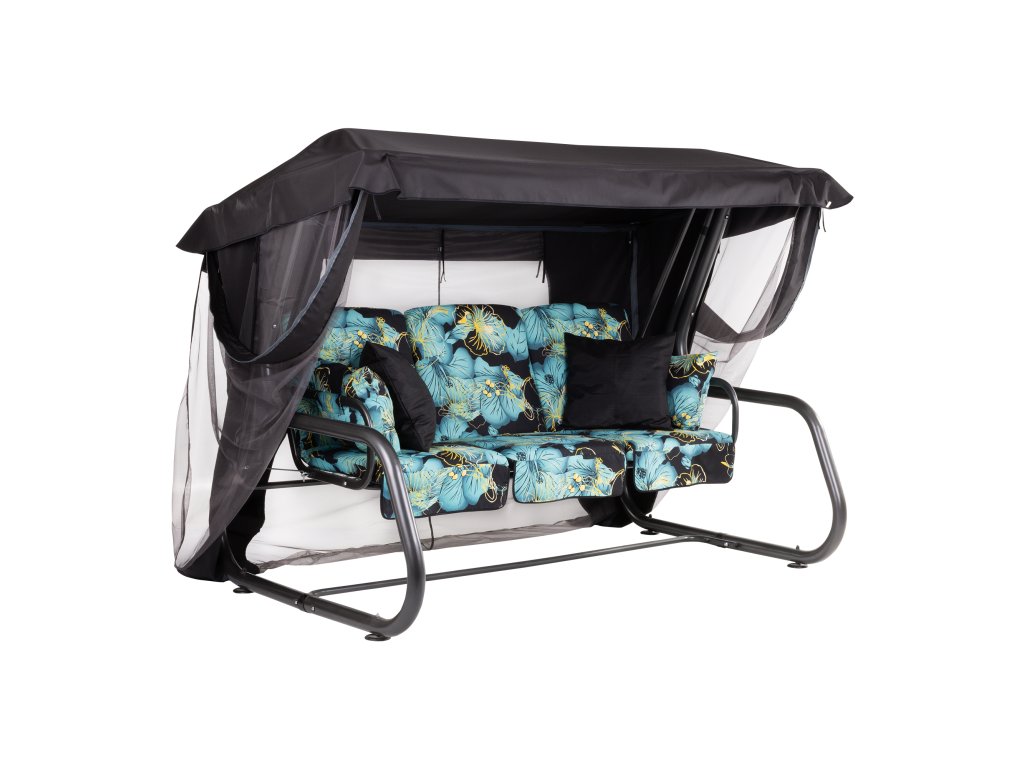 Houpačka Venezia s moskytiérouKombinace moderního designu, funkčnosti a pohodlí, která se bude perfektně hodit do každé zahrady nebo terasy. Stabilní ocelová konstrukce zajišťuje bezpečnost při používání, zatímco široké sedadlo, které lze rozložit na lůžko, umožňuje relaxaci s rodinou nebo přáteli. Charakteristické barvy a výrazný vzor podušek dodávají celému kusu nábytku elegantní a dekorativní vzhled.